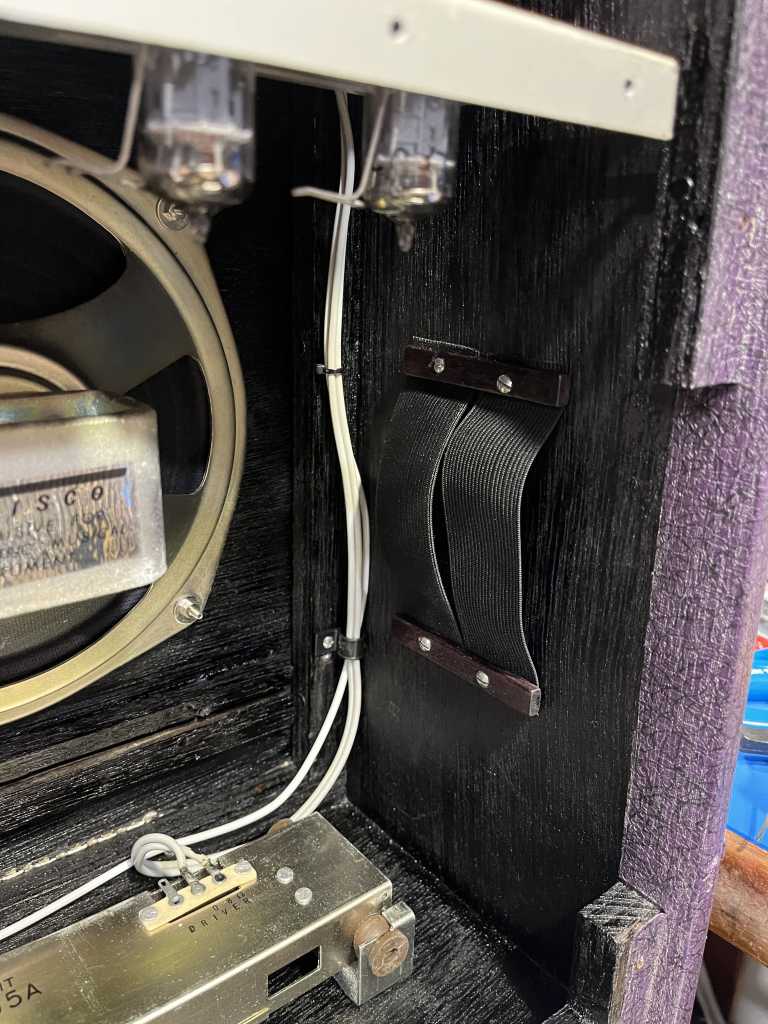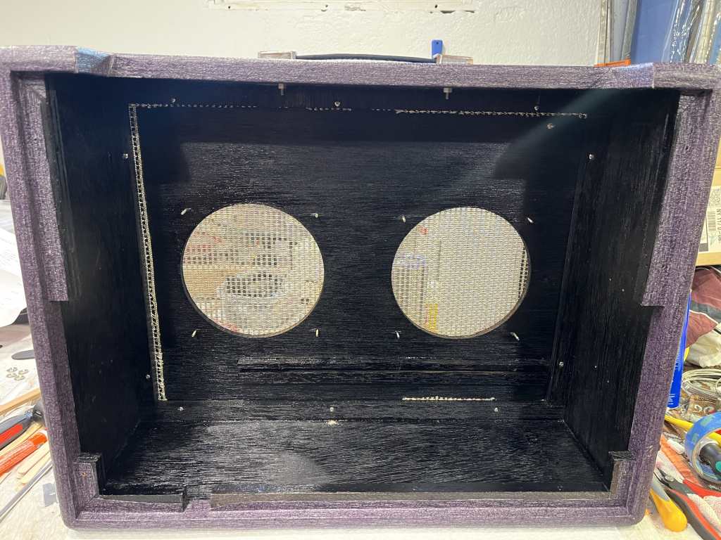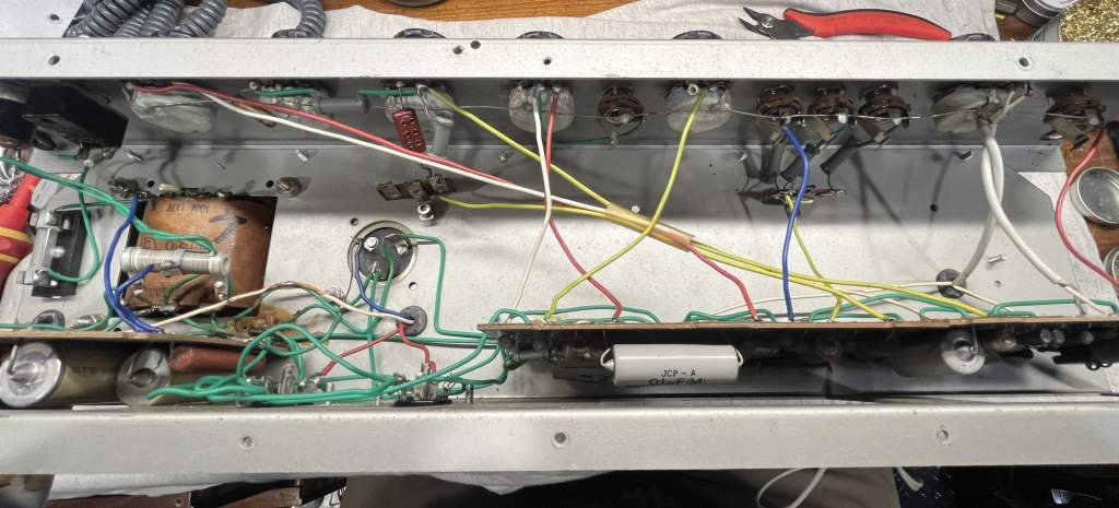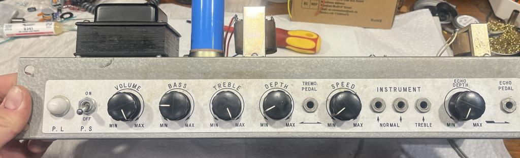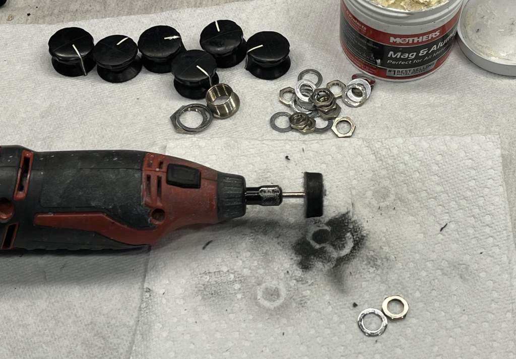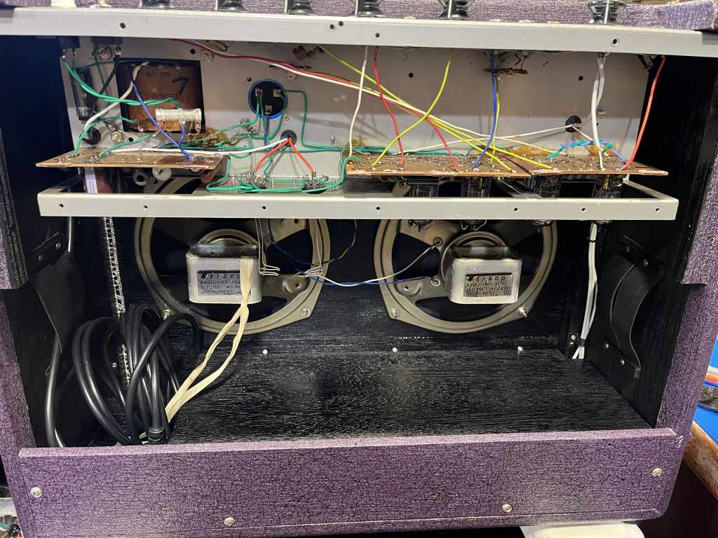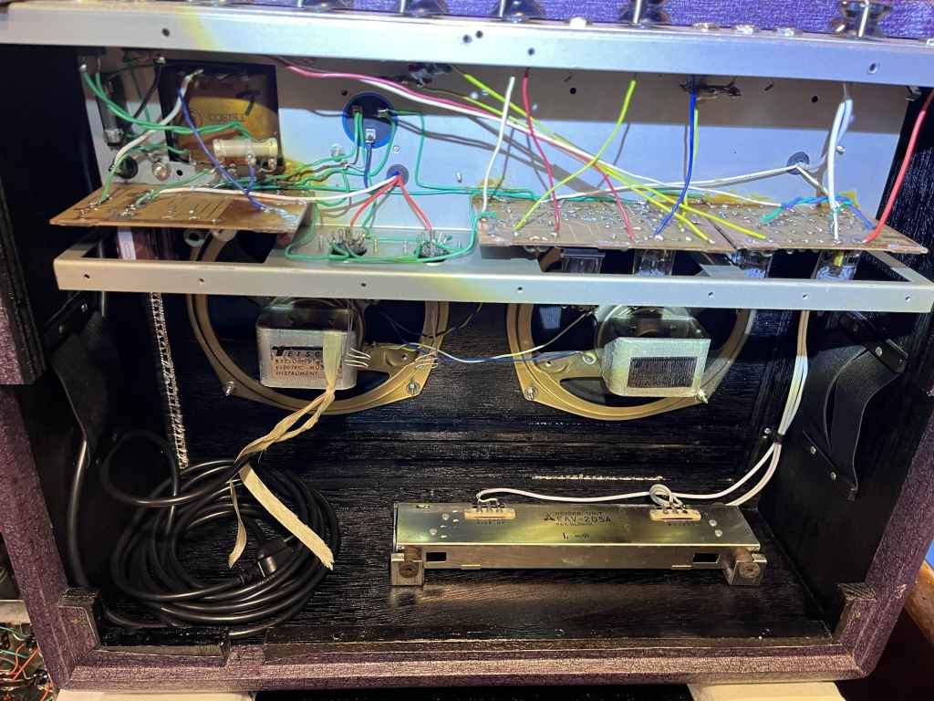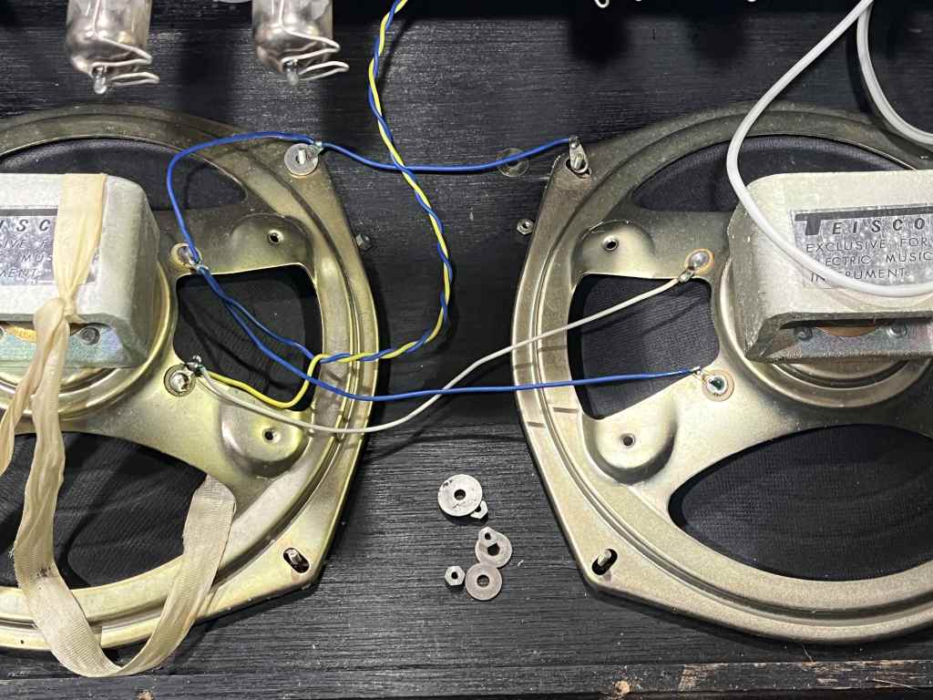Original pre-amp tubesOriginal 6BQ5 output tubesOriginal 50uf x 2 filter capInstalling new polypropylene capacitorsCreating a 3uf capacitor3uf /350v capacitor replacementLots of Acetone and cotton swabs to clean the old flux off the back of the boards.New 50×2 capacitorUltrasonic cleaning the knobs, jack nuts and washersPolishing up the nuts and washersPolishing the knobsDelaminating plywoodDelaminating plywoodUsing a syringe with wood glueLots o’ clamps and glueMore glueing down tolexBlack tinted shellac to refresh the interiorTrying to lessen the stains in the grill clothSpeakers look great!Reverb tank looks in ok shapeAging a replacement handleDying the white handle threadsTwo new handles, one relicedSanding off the corrosion and topcoat paintEmblem ready for clear Lacquer