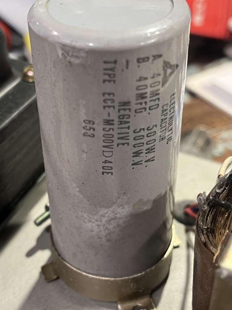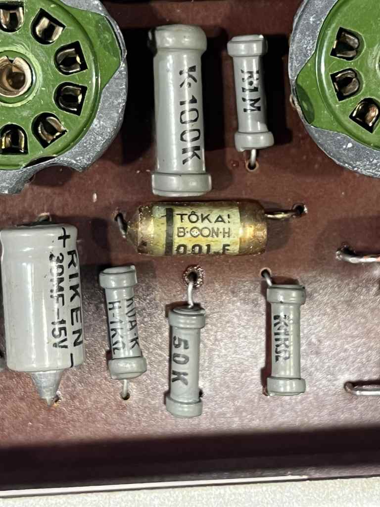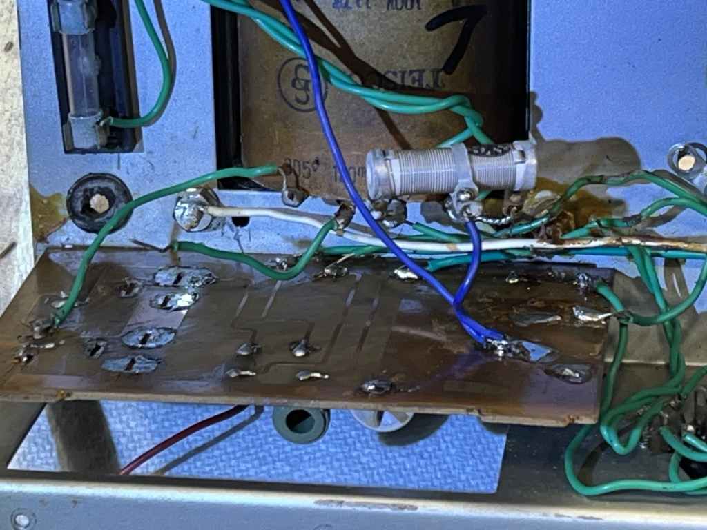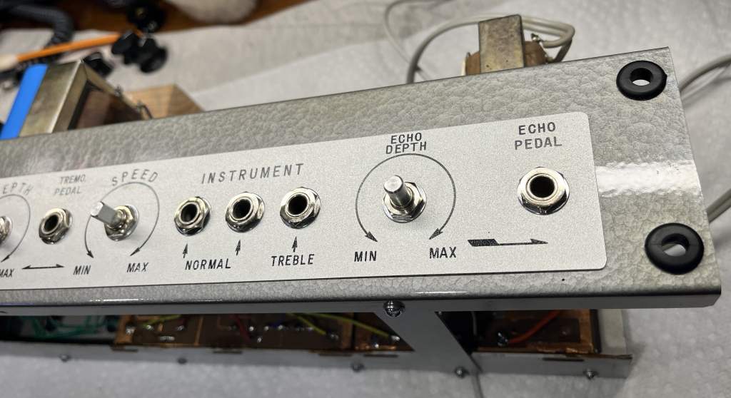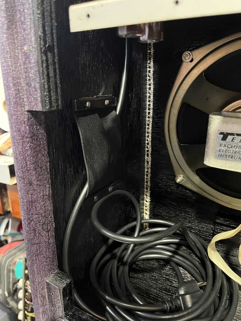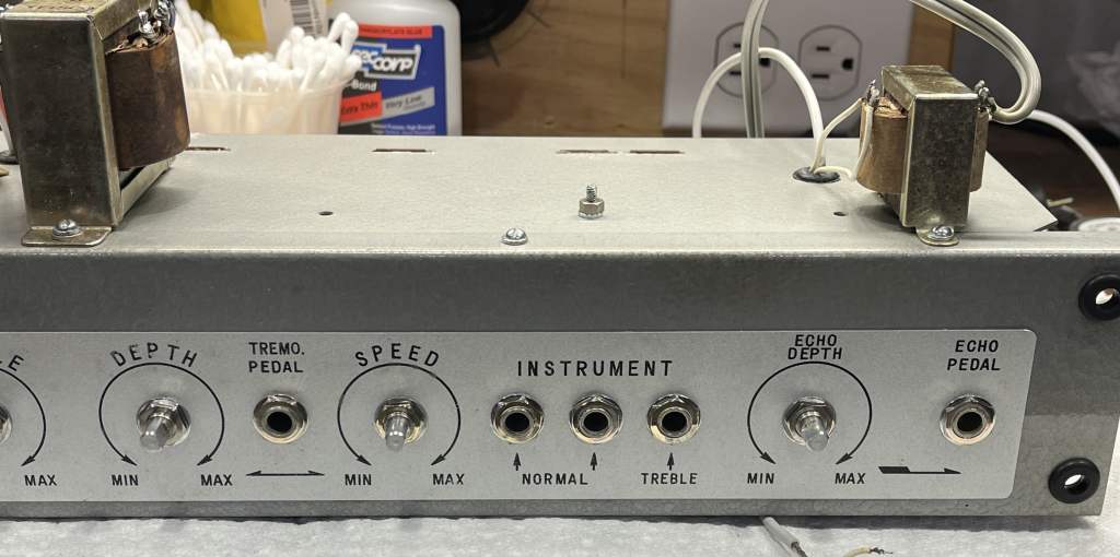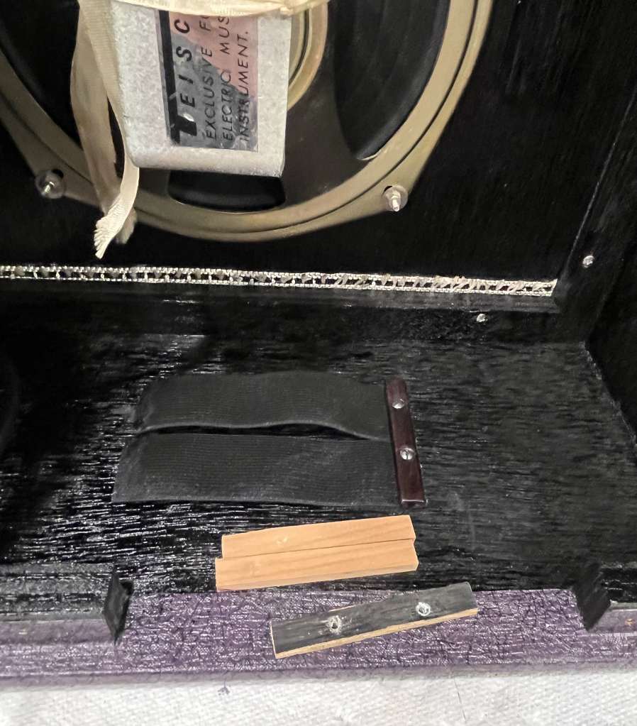 Original pre-amp tubesOriginal 6BQ5 output tubesOriginal 50uf x 2 filter capInstalling new polypropylene capacitorsCreating a 3uf capacitor3uf /350v capacitor replacementLots of Acetone and cotton swabs to clean the old flux off the back of the boards.New 50×2 capacitorUltrasonic cleaning the knobs, jack nuts and washersPolishing up the nuts and washersPolishing the knobsDelaminating plywoodDelaminating plywoodUsing a syringe with wood glueLots o’ clamps and glueMore glueing down tolexBlack tinted shellac to refresh the interiorTrying to lessen the stains in the grill clothSpeakers look great!Reverb tank looks in ok shapeAging a replacement handleDying the white handle threadsTwo new handles, one relicedSanding off the corrosion and topcoat paintEmblem ready for clear Lacquer