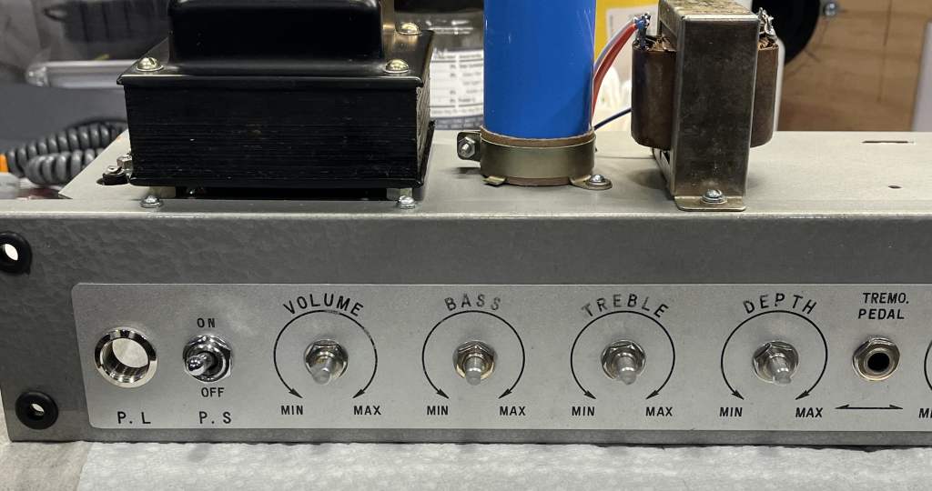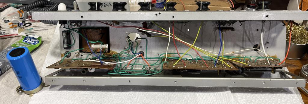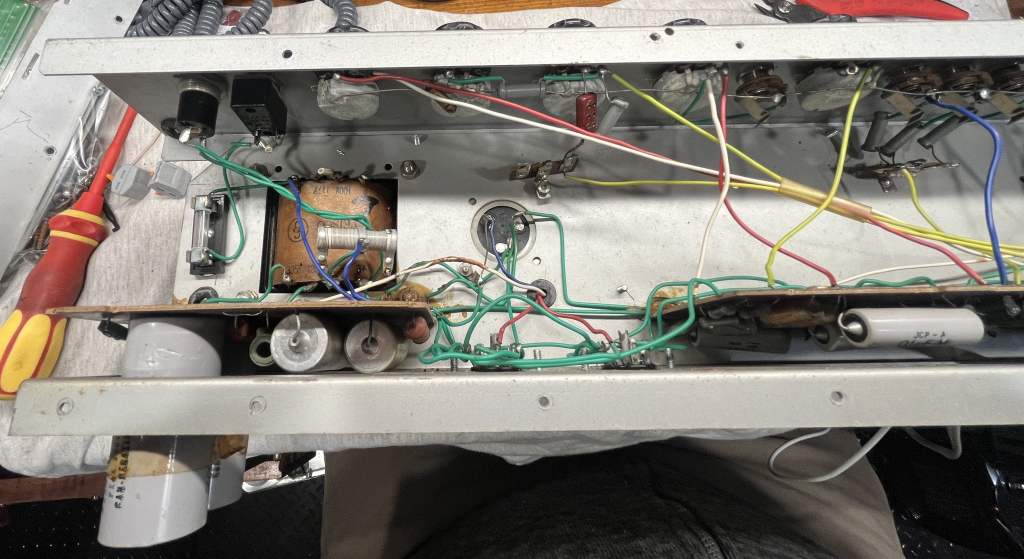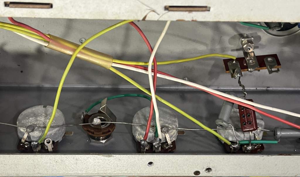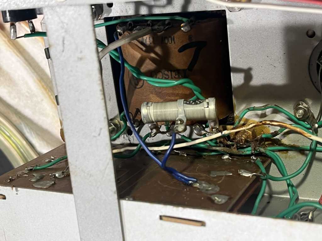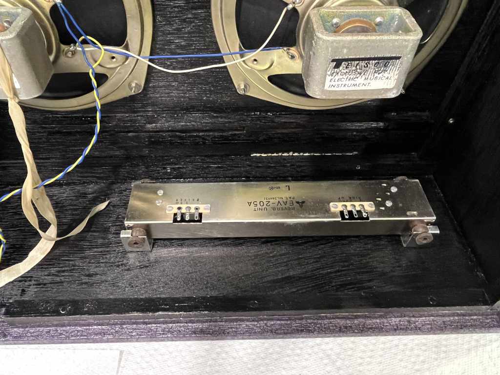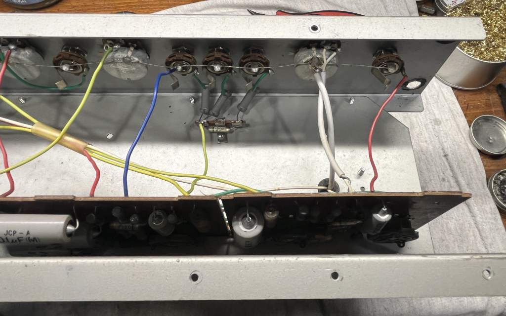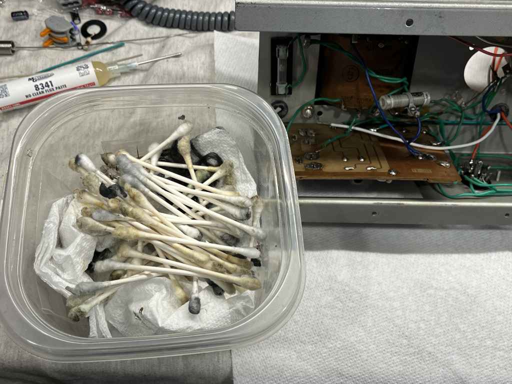 Original pre-amp tubesOriginal 6BQ5 output tubesOriginal 50uf x 2 filter capInstalling new polypropylene capacitorsCreating a 3uf capacitor3uf /350v capacitor replacementLots of Acetone and cotton swabs to clean the old flux off the back of the boards.New 50×2 capacitorUltrasonic cleaning the knobs, jack nuts and washersPolishing up the nuts and washersPolishing the knobsDelaminating plywoodDelaminating plywoodUsing a syringe with wood glueLots o’ clamps and glueMore glueing down tolexBlack tinted shellac to refresh the interiorTrying to lessen the stains in the grill clothSpeakers look great!Reverb tank looks in ok shapeAging a replacement handleDying the white handle threadsTwo new handles, one relicedSanding off the corrosion and topcoat paintEmblem ready for clear Lacquer