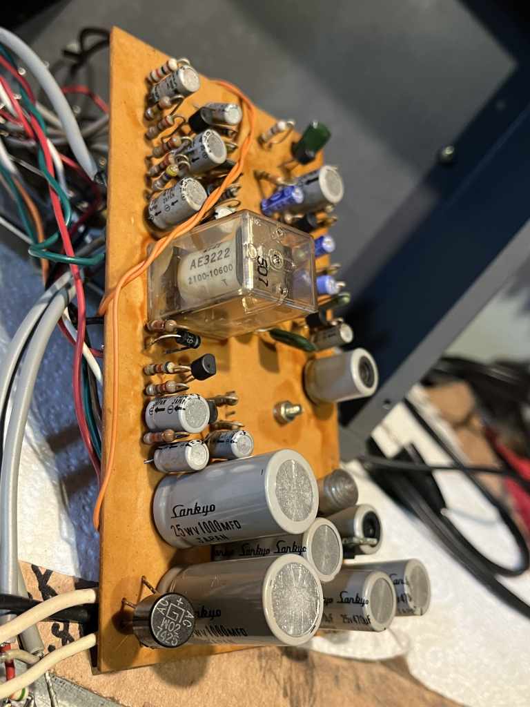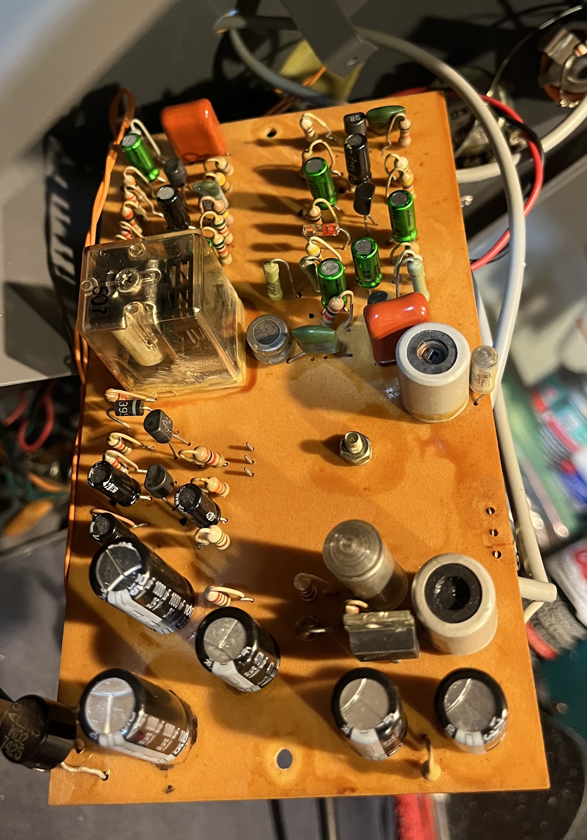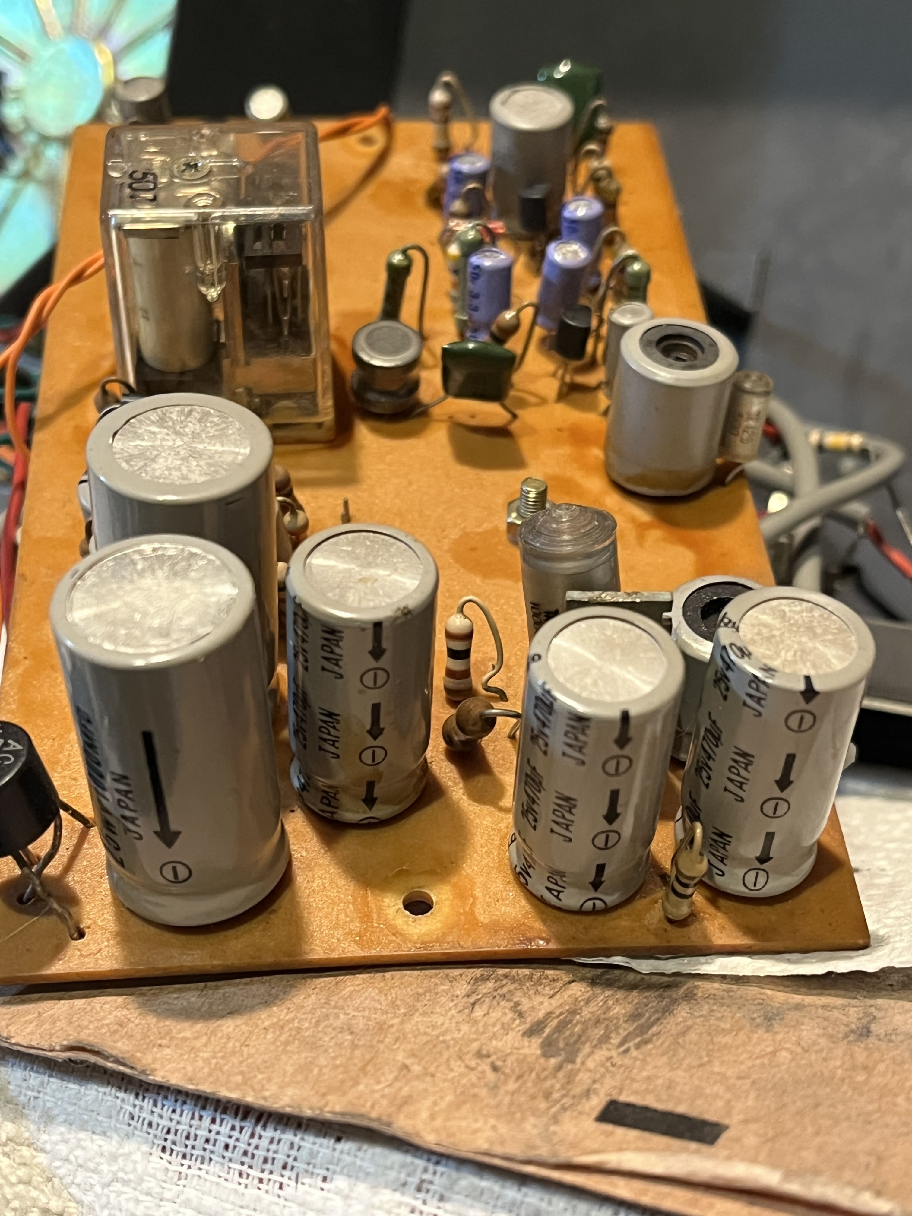 Complete in it’s original case.Heads need to be cleaned, lots of residue on themIt’s in great shape, just a few scratches.What it looks like as opened for the first time in probably 49 years.Looks like the same capstan motor in an Ace Tone EC-10.Time to dig in and replace old parts!Combination of Sankyo and Matsushita (Panasonic) caps.All the capacitors are now replaced and upgraded to film caps in a few spots.Polishing the aluminum knobs with a drill.Rubber renue on the pinch roller to clean and condition it.