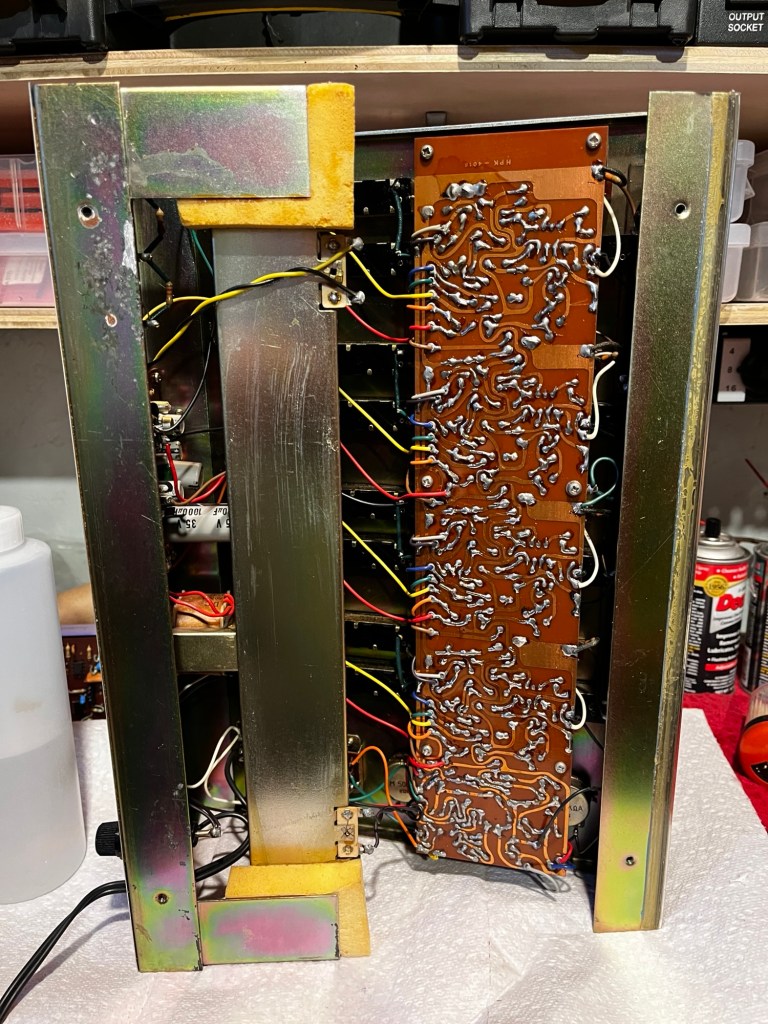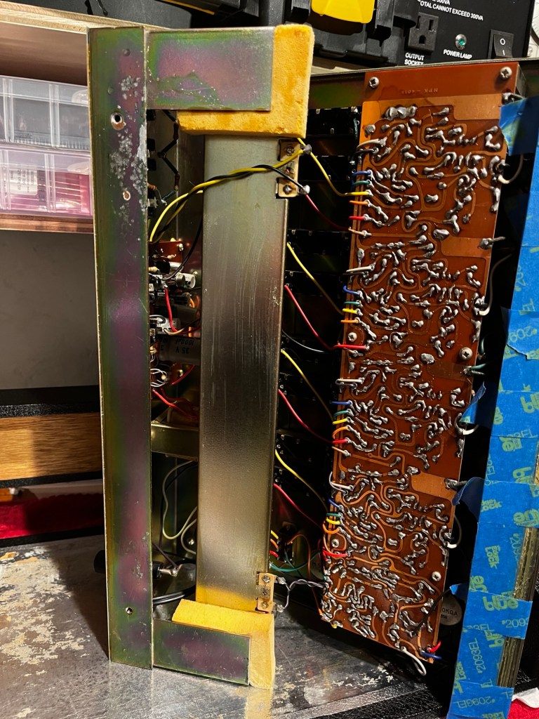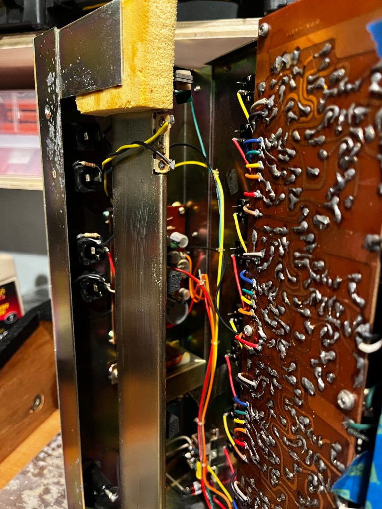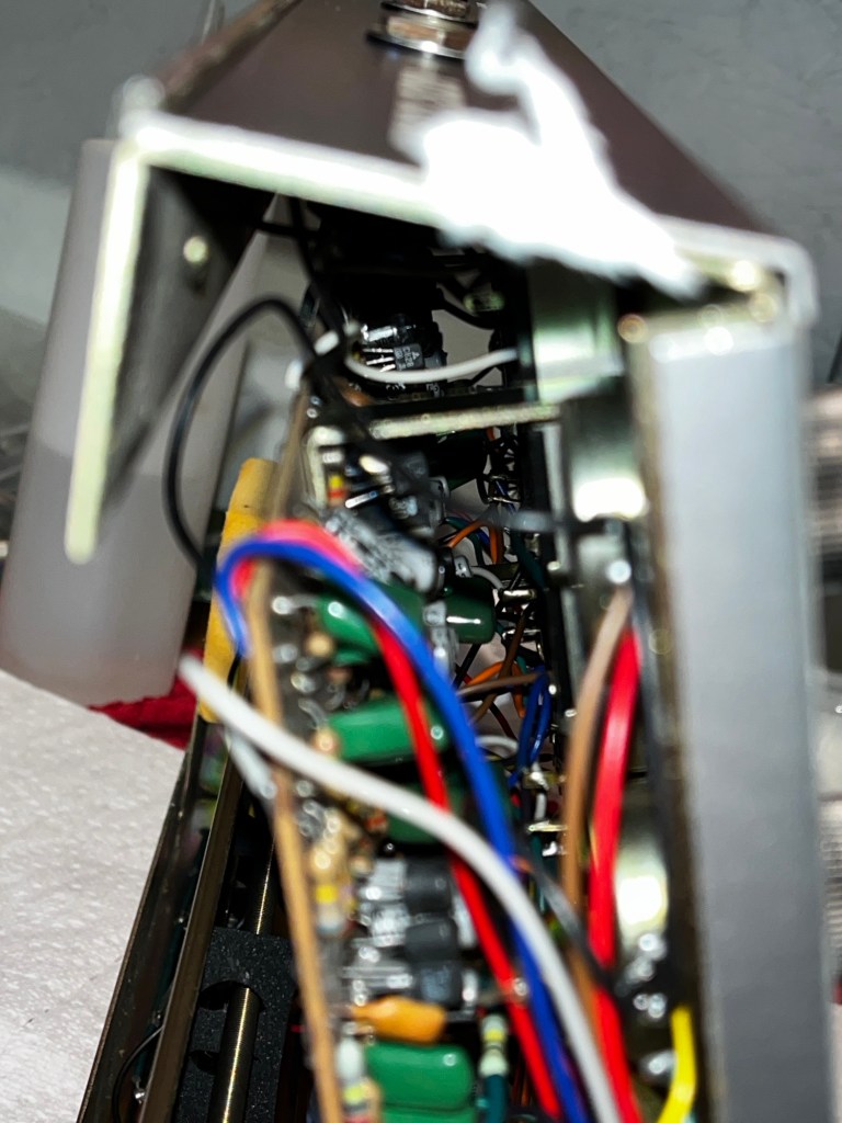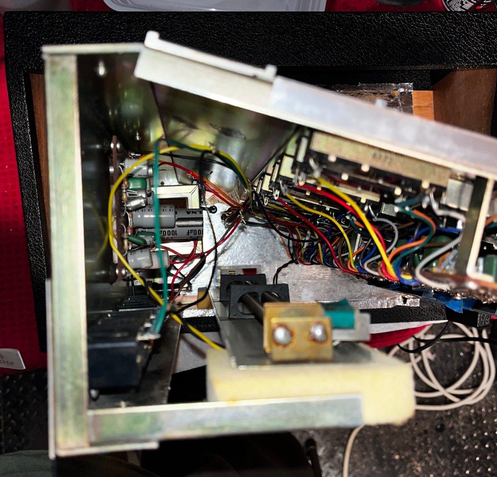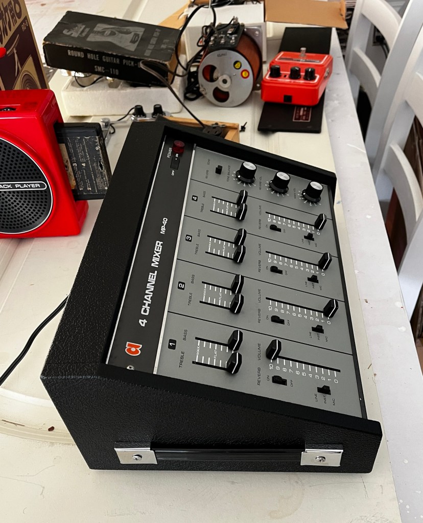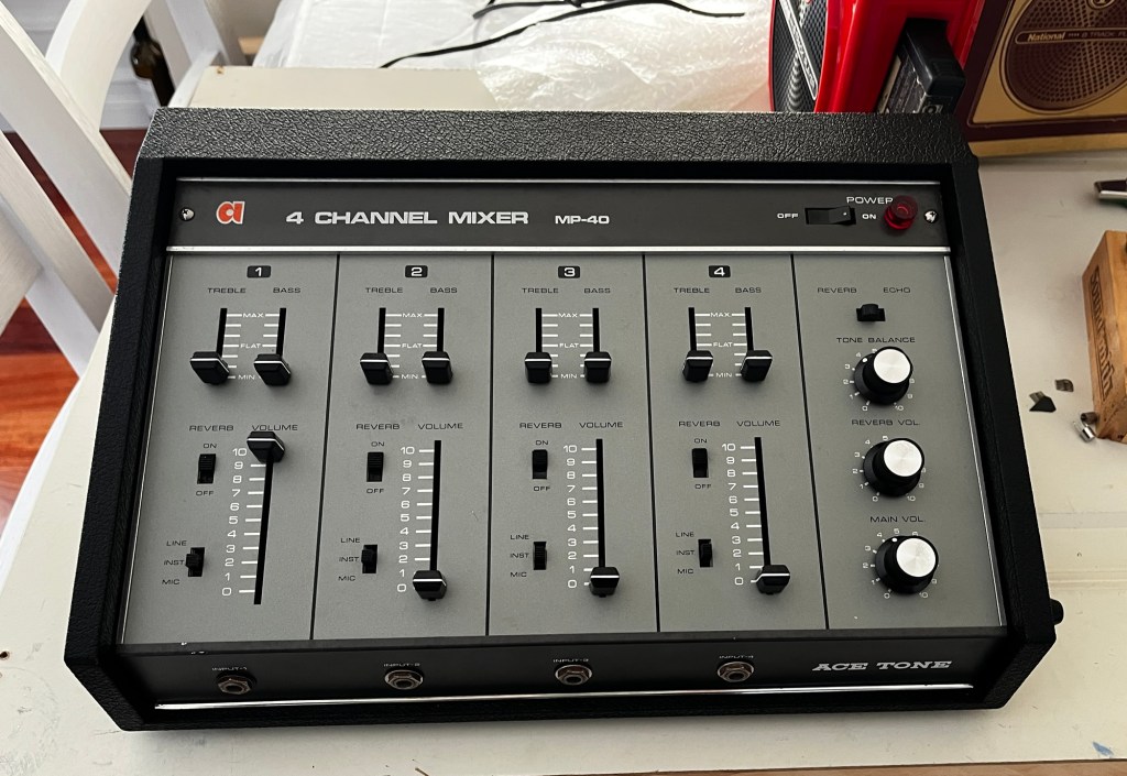 This old Ace Tone mixer was taken apart and completely cleaned and detailed. It needed a little work to make it nice. I replaced a paper in oil cap on the incoming power as standard practice since they are notorious for leaking voltage. I cleaned and lubed all the pots and faders and cleaned all the jacks with DeOxit. I wired the unit for 117v. I glued a plastic chrome strip on the lower front back in place with contact adhesive. I put a lot of work into cleaning and fixing this guy up and it shows. This old mixer looks great! The reverb and tone knobs both have a chip on the top edge. Those both as well as the volume knob have some fading on the painted aluminum top hat. It has a few chips in the paint on some of the edges. The tolex is in amazing condition. All the channels and faders work as expected. It’s very quiet and only hisses a little if the channel volume is maxed out and you set the master volume past 8. It has a nice dual spring reverb. I made a quick video or just some basic tests and functionality.