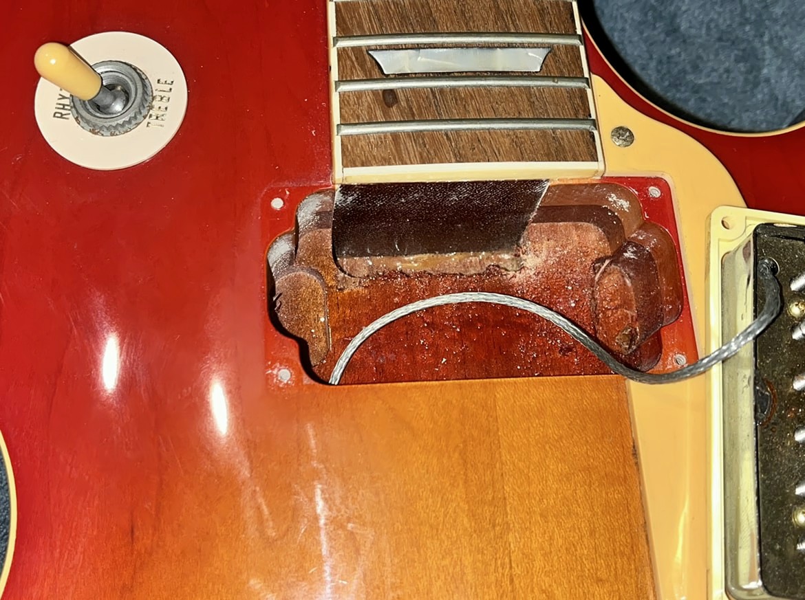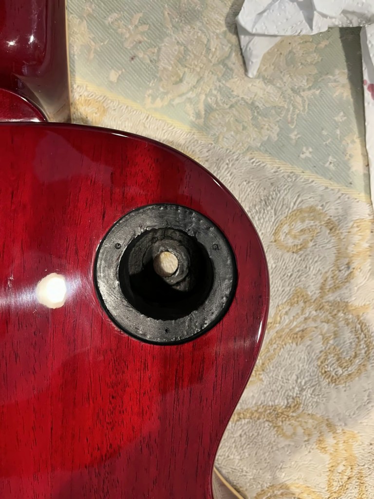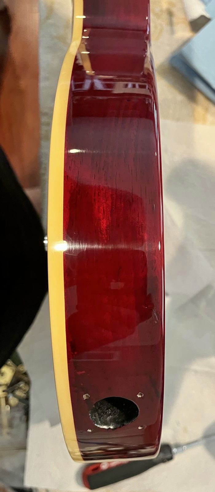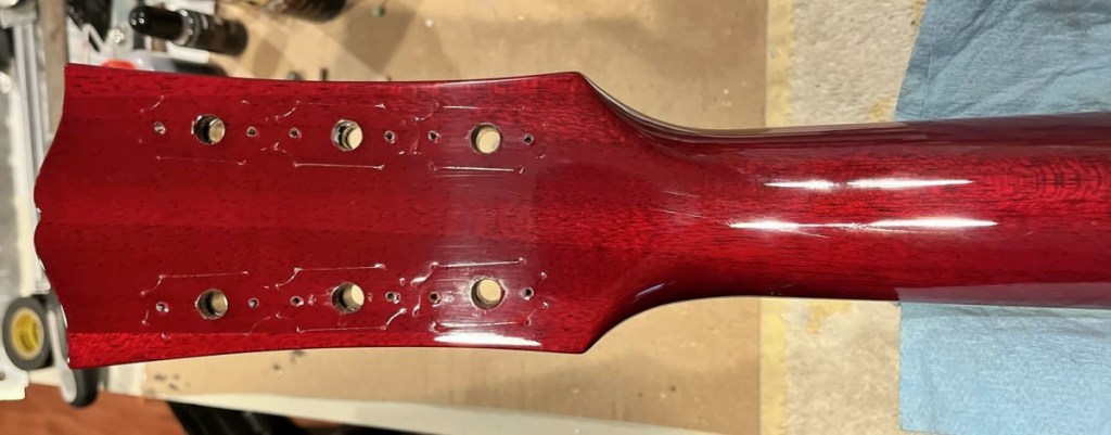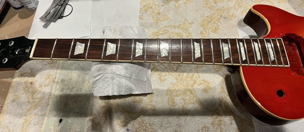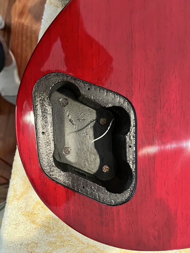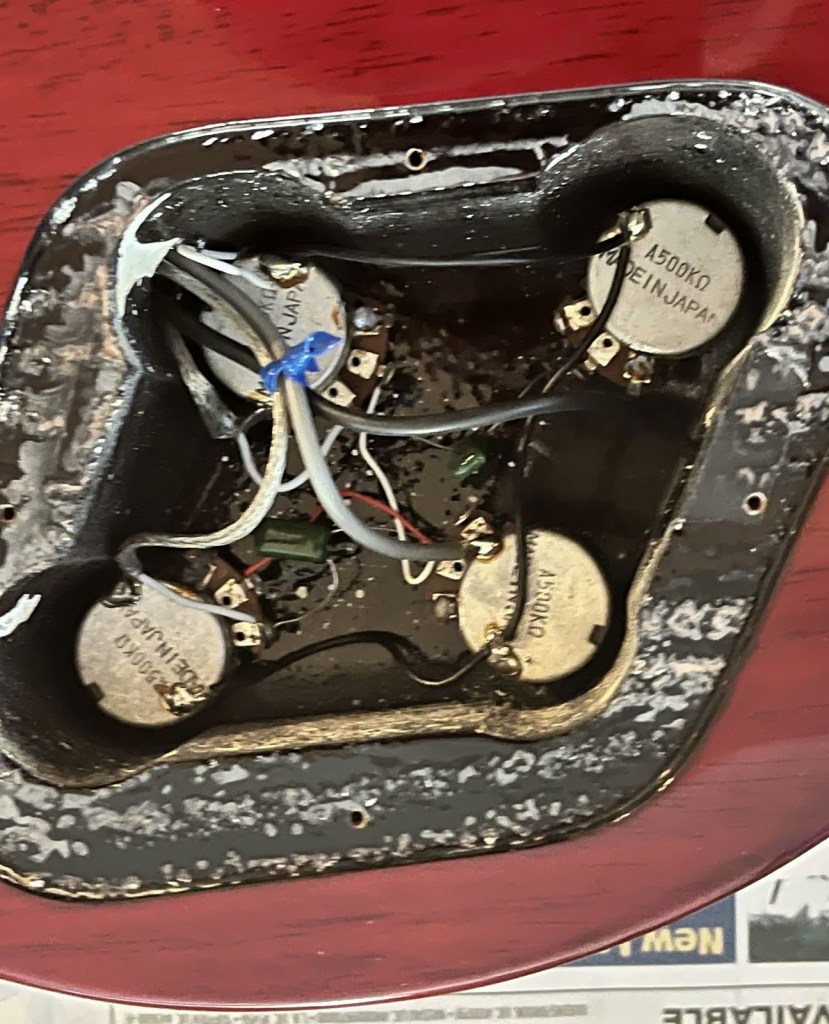 Arrival!Original Sale sticker mark from 1997Offset tenonBlS-95 pickups15.5k neck and 15.6 bridge.Buffing out the topCleaned pickup routesFrets aren’t in bad shape at allFret leveling in progressCrowning begins….Crowned fretsSanded fretsPolished fretsPolished frets closeupFretboard sanded and cleanedOiled fretboardShielded switch bore to match cavity.Cleaning up cavityBridge and tail polishedSanded paint chipsSuperglue fillSanded smoothBuffed out, much less noticeableSanded and buffing backPolishing the back of the headstock