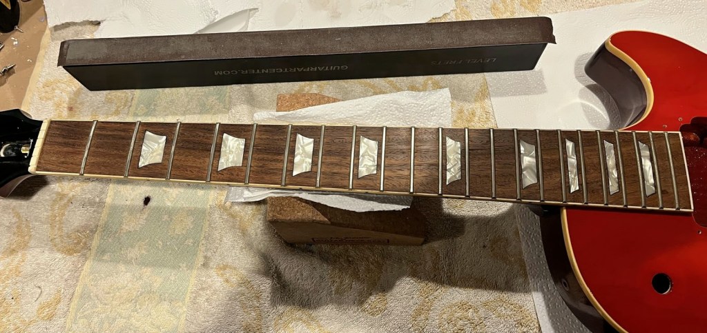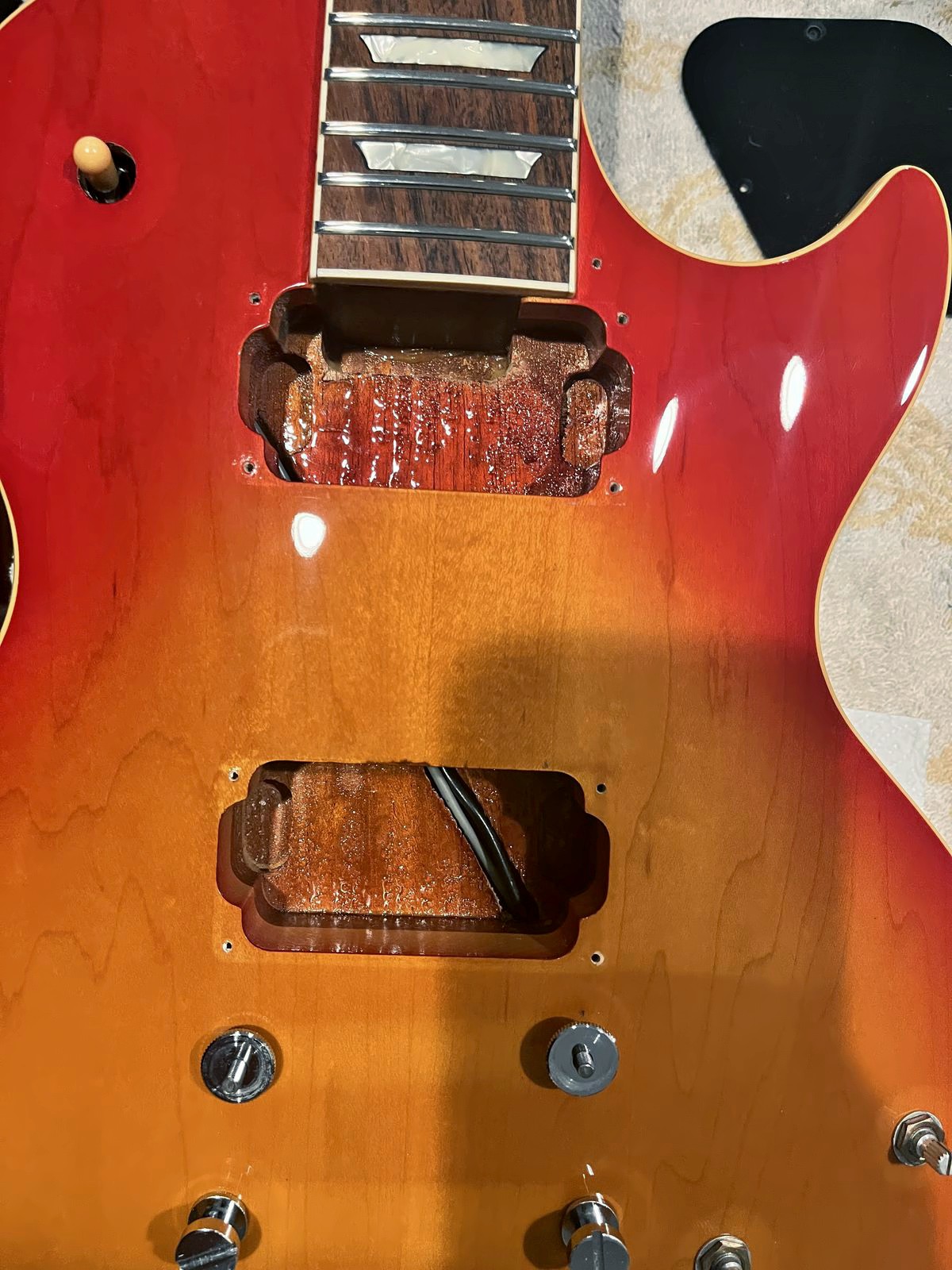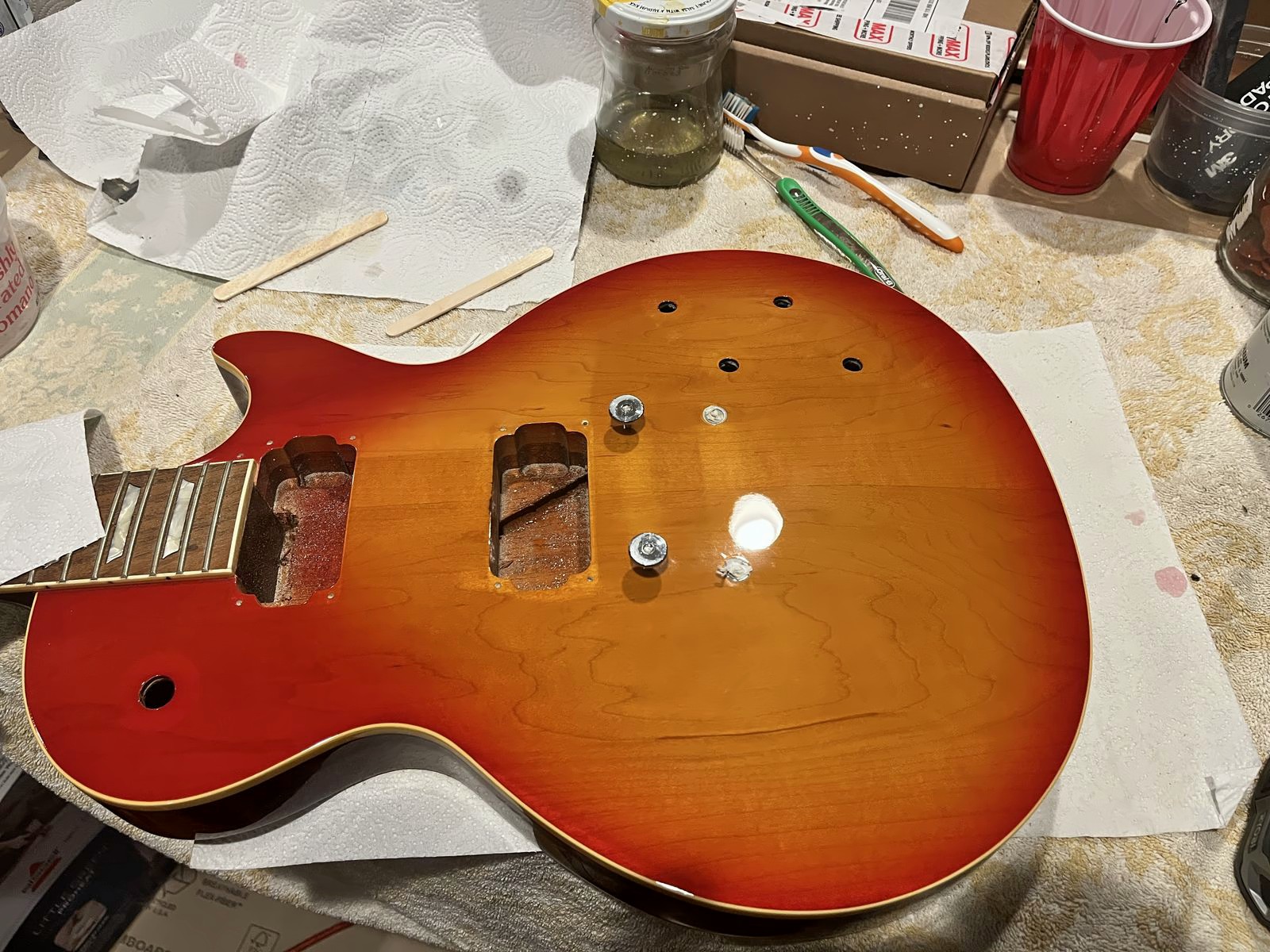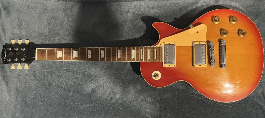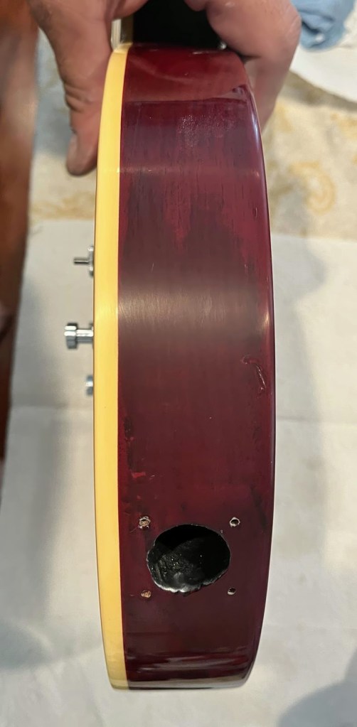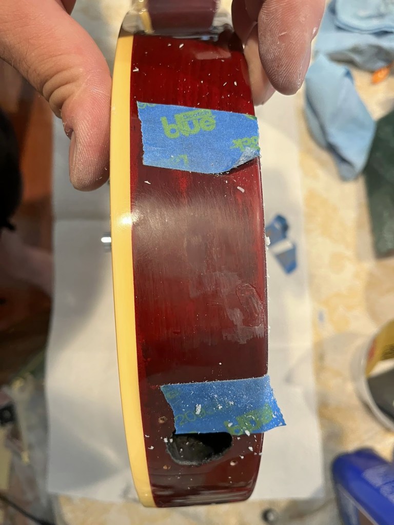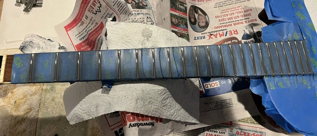 Arrival!Original Sale sticker mark from 1997Offset tenonBlS-95 pickups15.5k neck and 15.6 bridge.Buffing out the topCleaned pickup routesFrets aren’t in bad shape at allFret leveling in progressCrowning begins….Crowned fretsSanded fretsPolished fretsPolished frets closeupFretboard sanded and cleanedOiled fretboardShielded switch bore to match cavity.Cleaning up cavityBridge and tail polishedSanded paint chipsSuperglue fillSanded smoothBuffed out, much less noticeableSanded and buffing backPolishing the back of the headstock