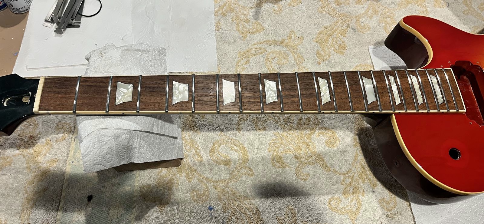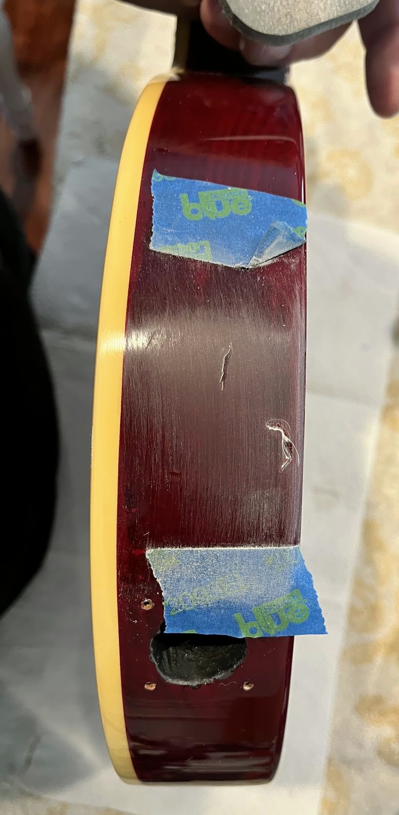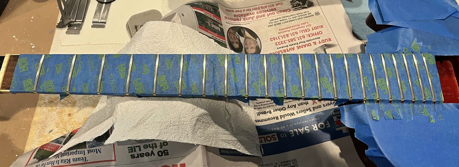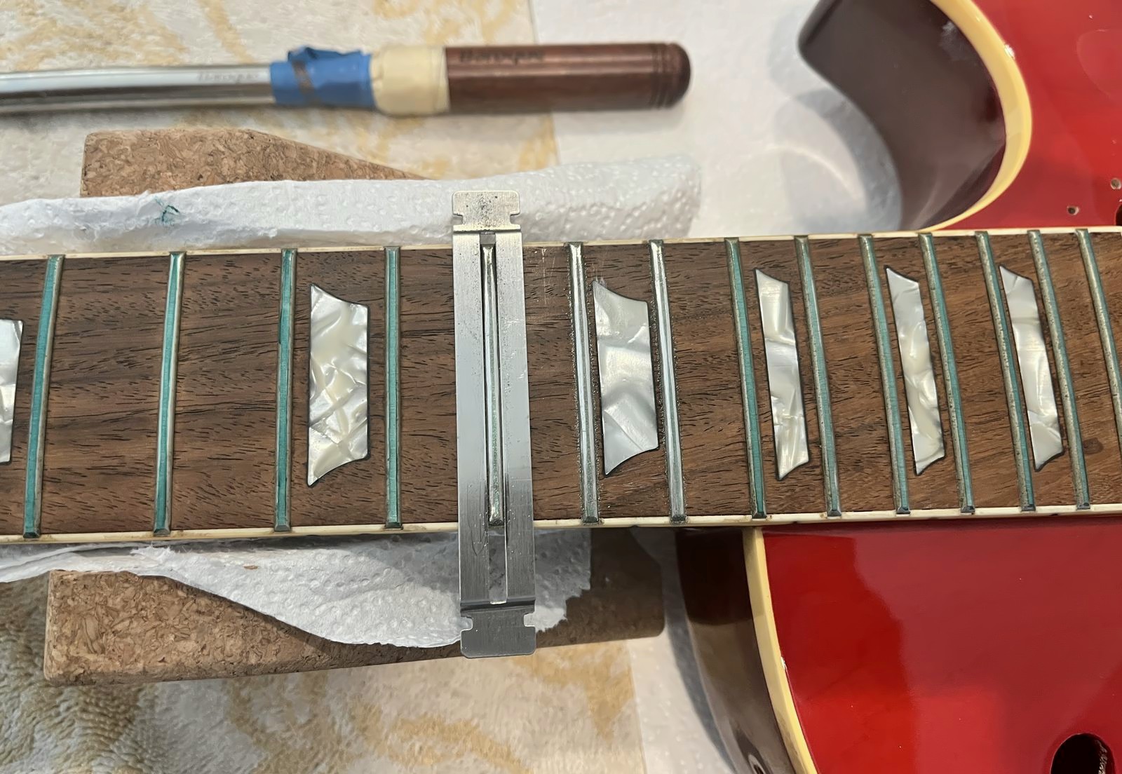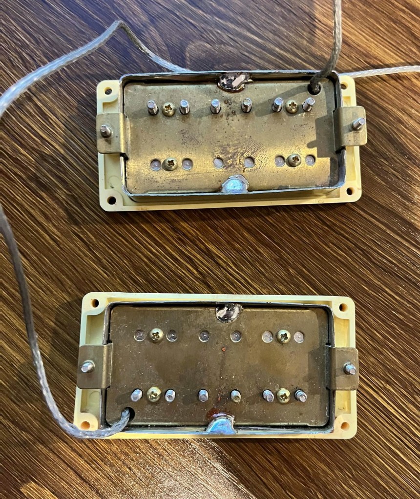 Arrival!Original Sale sticker mark from 1997Offset tenonBlS-95 pickups15.5k neck and 15.6 bridge.Buffing out the topCleaned pickup routesFrets aren’t in bad shape at allFret leveling in progressCrowning begins….Crowned fretsSanded fretsPolished fretsPolished frets closeupFretboard sanded and cleanedOiled fretboardShielded switch bore to match cavity.Cleaning up cavityBridge and tail polishedSanded paint chipsSuperglue fillSanded smoothBuffed out, much less noticeableSanded and buffing backPolishing the back of the headstock