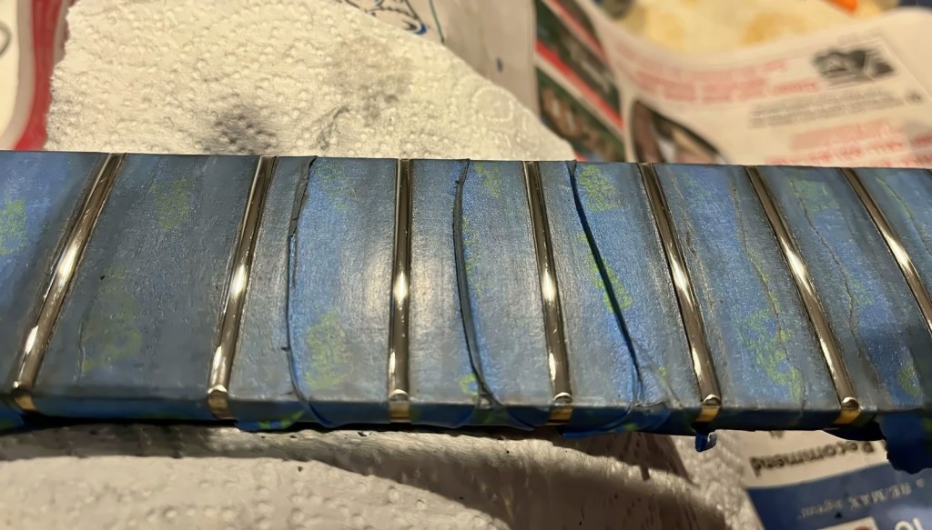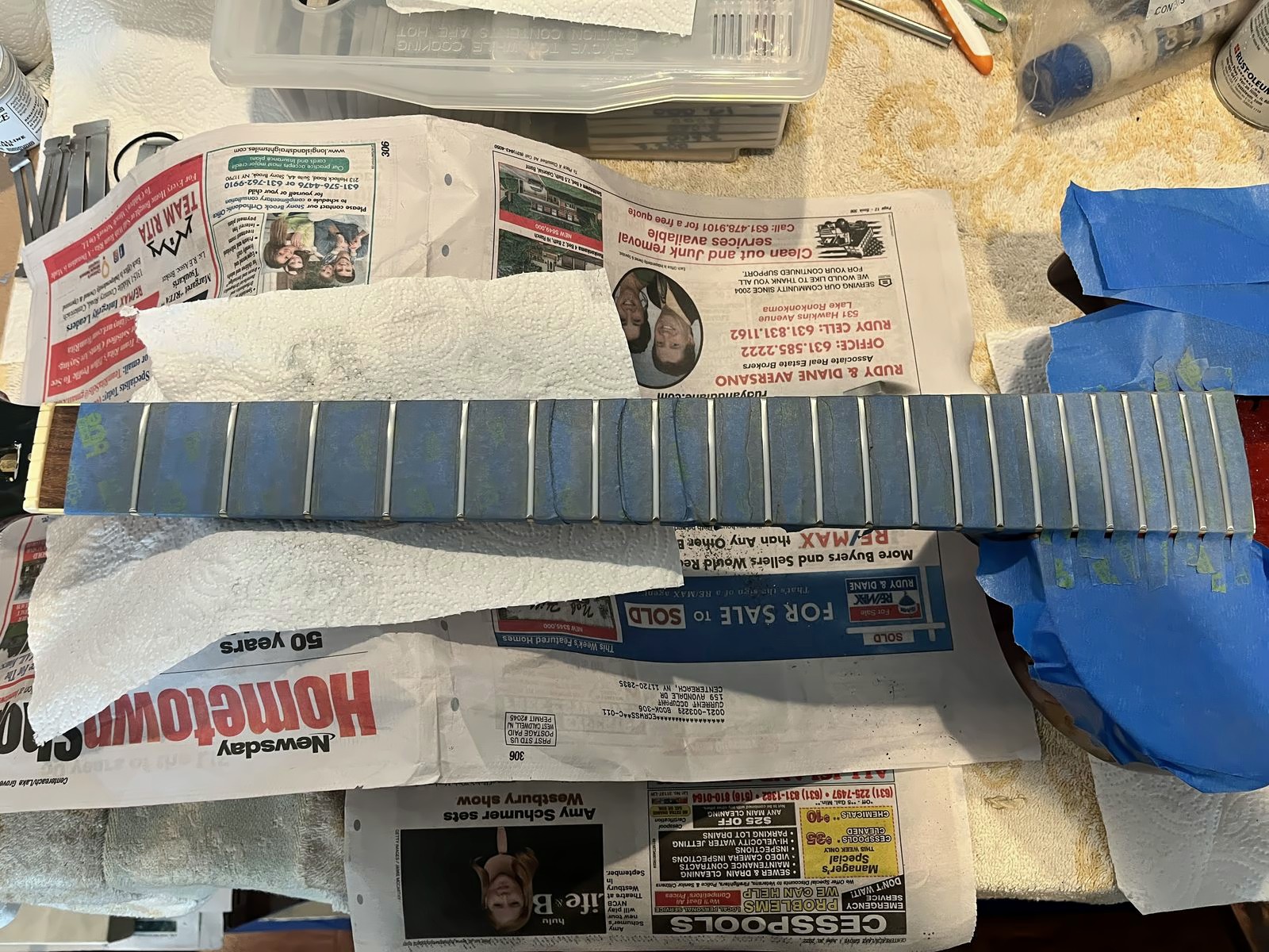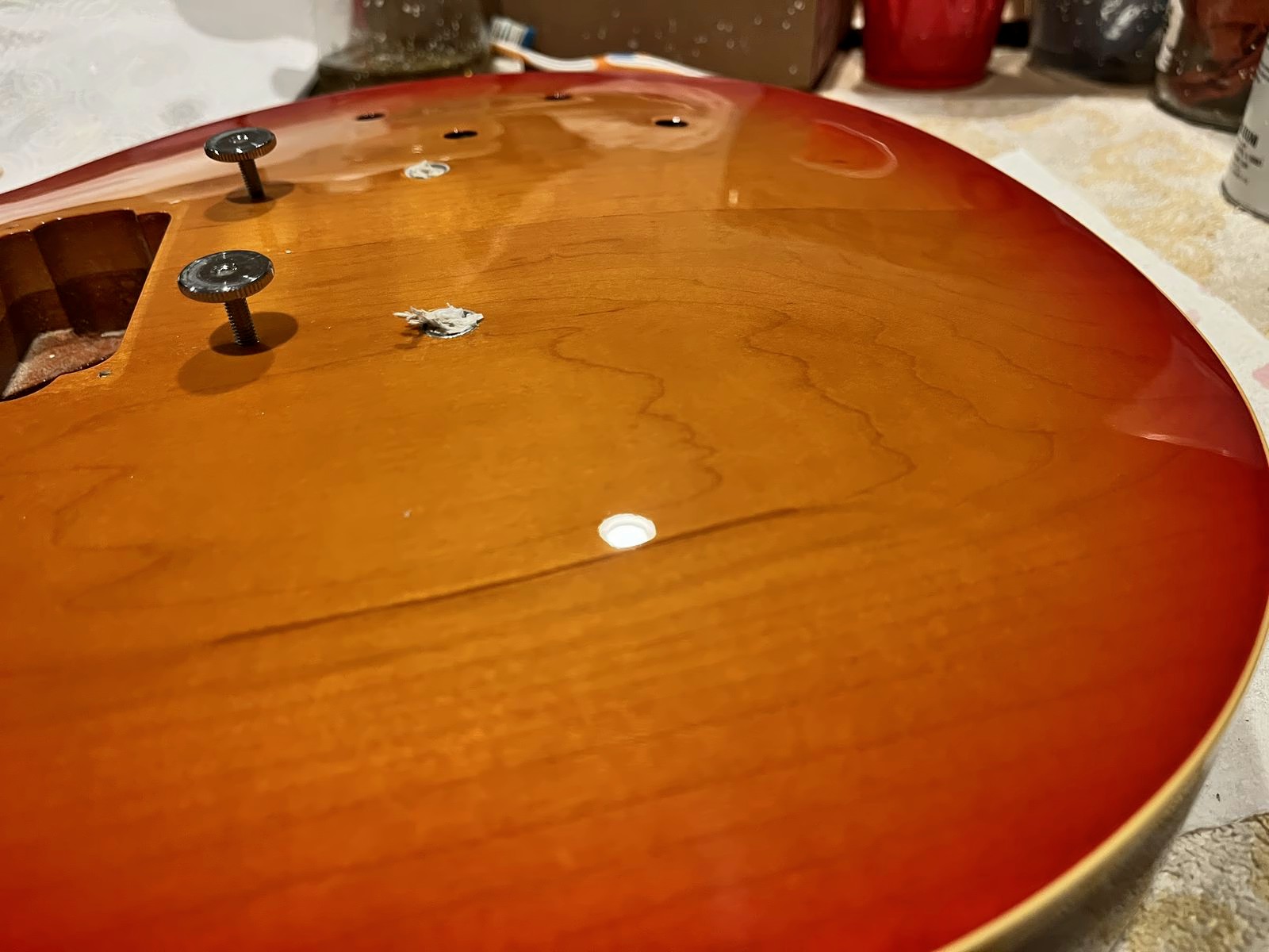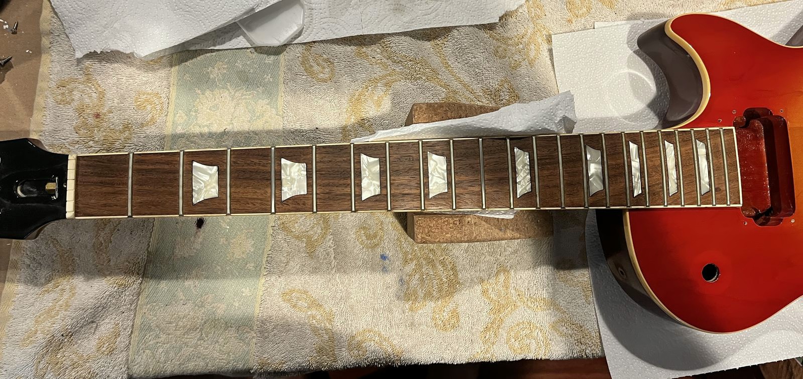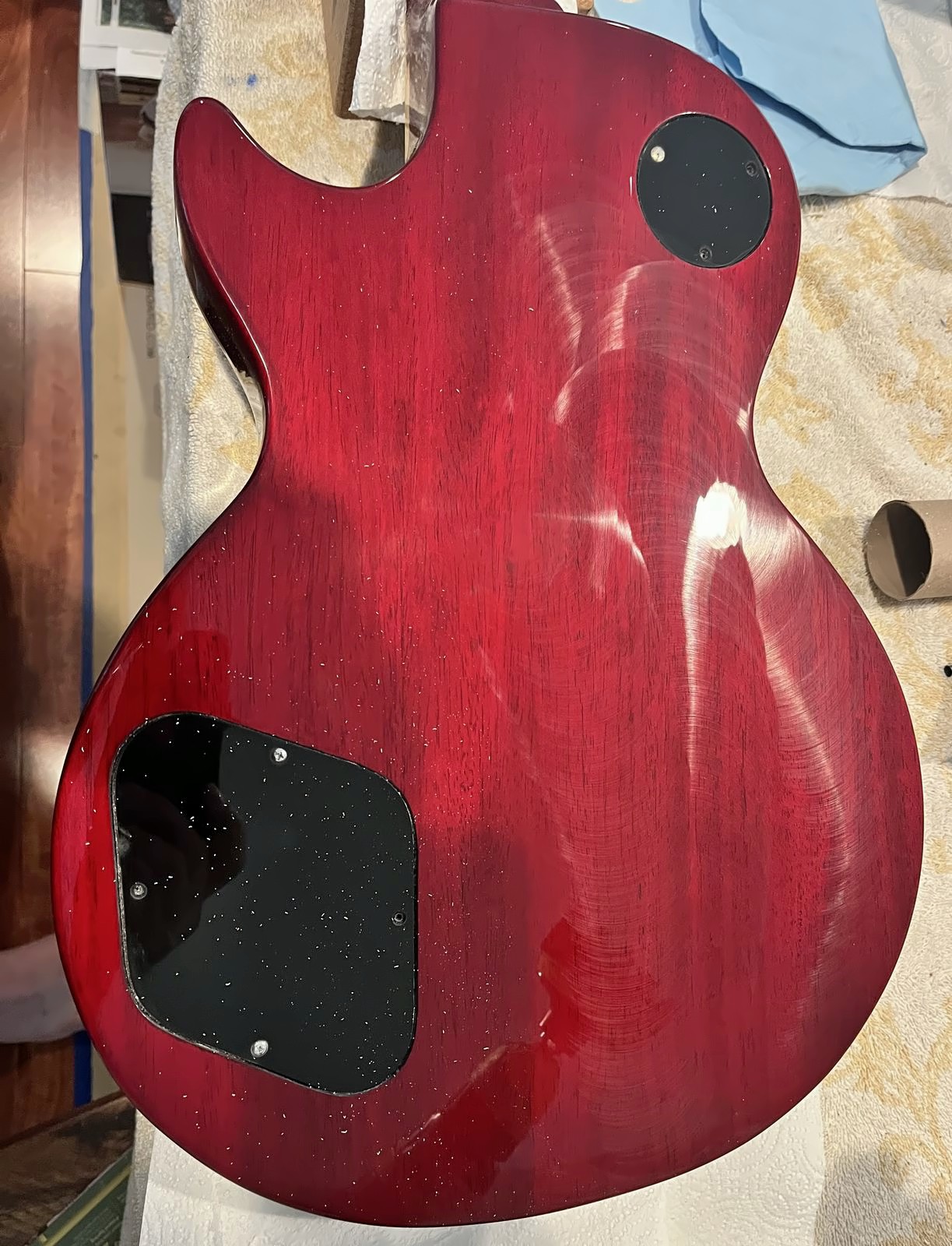 Arrival!Original Sale sticker mark from 1997Offset tenonBlS-95 pickups15.5k neck and 15.6 bridge.Buffing out the topCleaned pickup routesFrets aren’t in bad shape at allFret leveling in progressCrowning begins….Crowned fretsSanded fretsPolished fretsPolished frets closeupFretboard sanded and cleanedOiled fretboardShielded switch bore to match cavity.Cleaning up cavityBridge and tail polishedSanded paint chipsSuperglue fillSanded smoothBuffed out, much less noticeableSanded and buffing backPolishing the back of the headstock