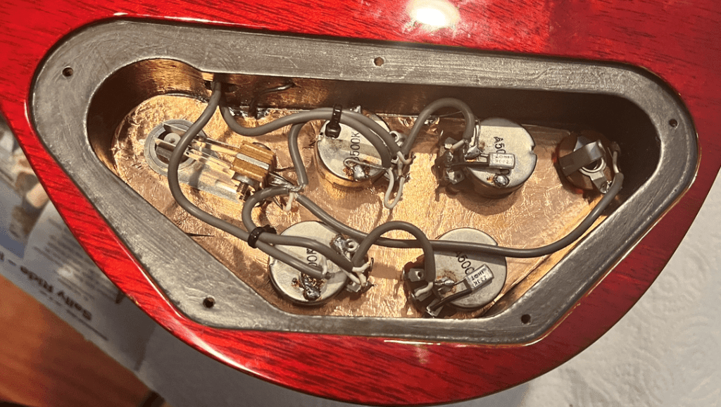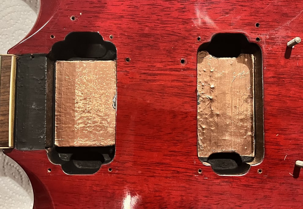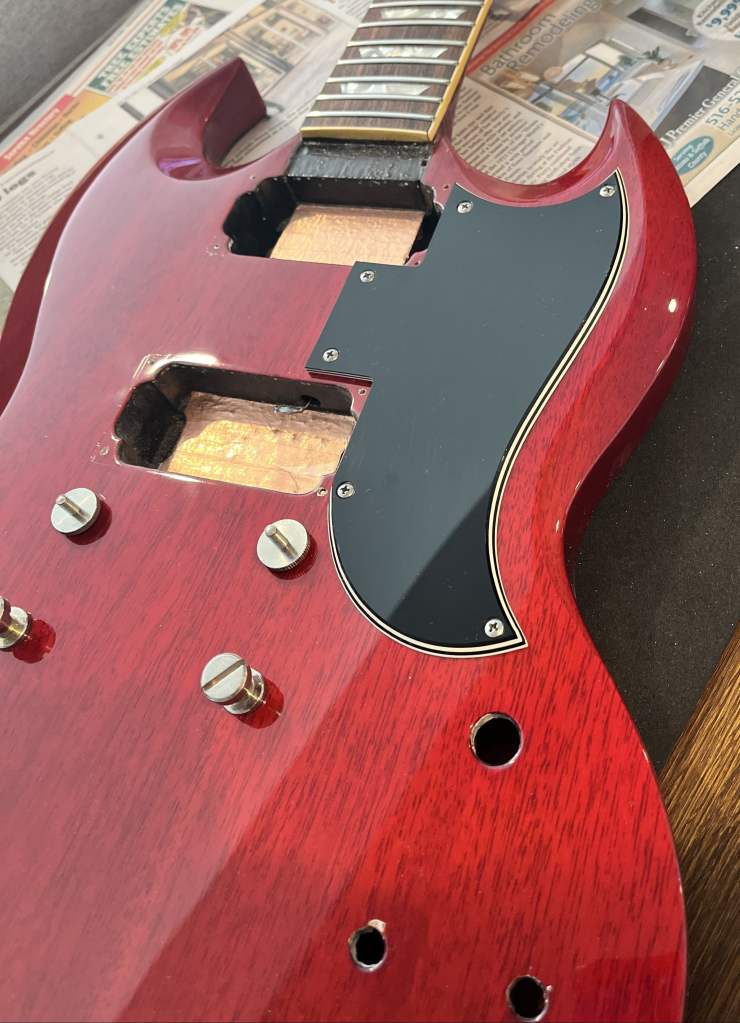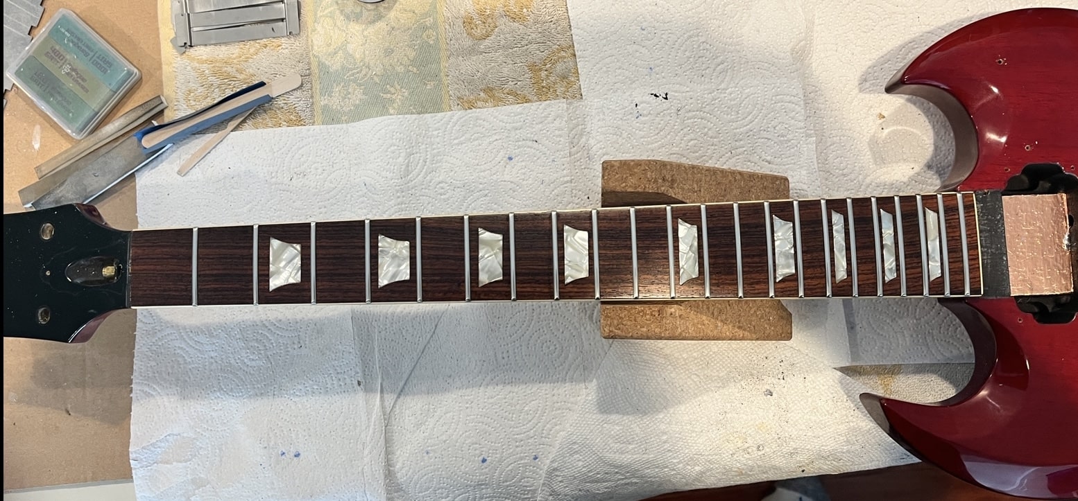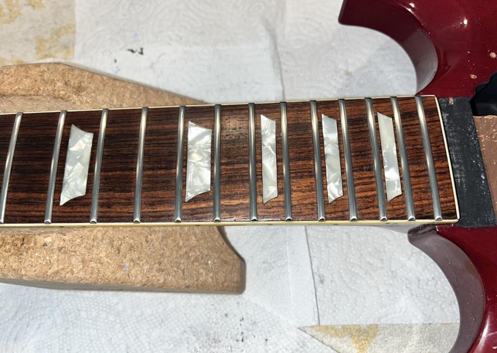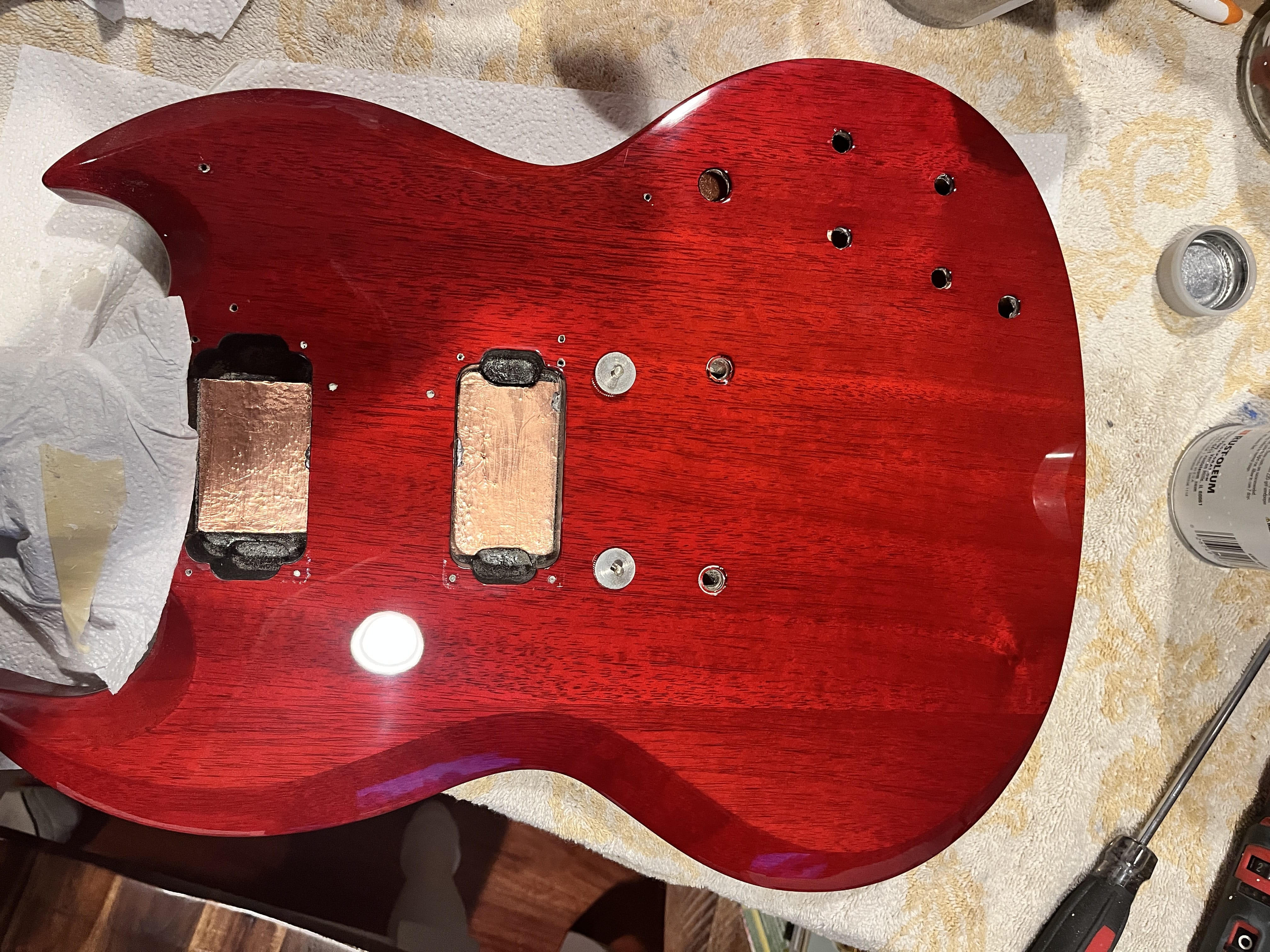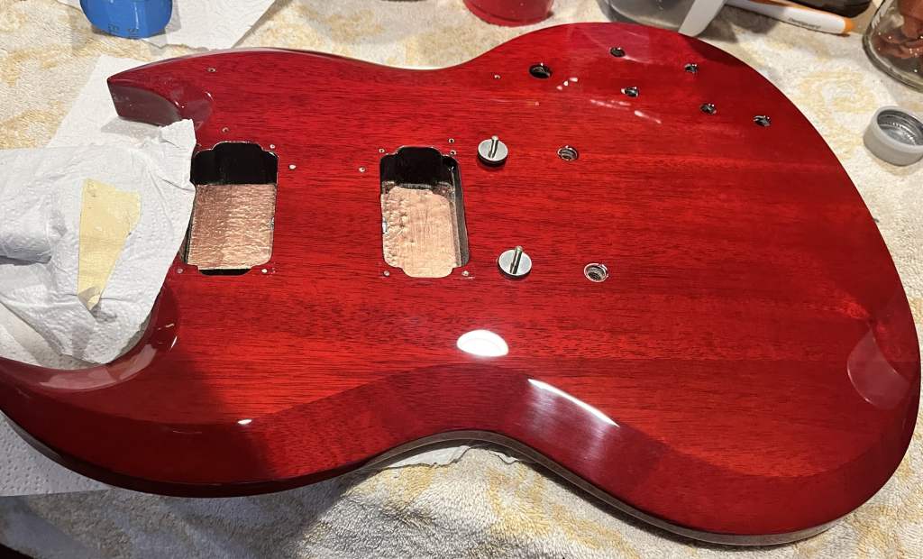 Straight from Japan2nd gen VH-1 pickupsFull size potsAdding shieldingThree coatsConnecting cavities with wireSanded the rough poly bumps outShielding paintMore shielding and connected the control cavity to the pickup routesControl Cavity all done.Shielded cavity coverNot mint but much better8.208k on the neck and 8.088k on the bridge (not a typo!)Took the cover off a pickup to see if it had ceramic magnets and found Alnico magnets instead!Removing rust with vinegarPickup screws restoredAll Cleaned upFrets beam leveledStarting to crown fretsFrets crowned and sanded smoothFretboard cleaned and oiledNice rosewood grainSanded smooth with 1500,2500 and then polishing the topangle shotBuffed up pickguardStarting to come togetherKnobs are too bright, I’m going to swap them out for more vintage reflectors.Sanded headstock and some touchupAll polished upCA glue added to fix loose tuner screwholesStarting to fit a new nut.Scribing board radiusNew nut complete