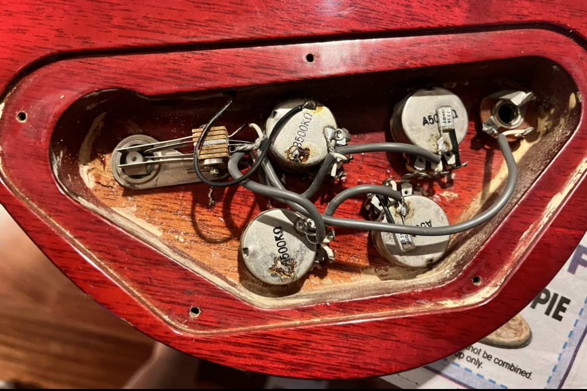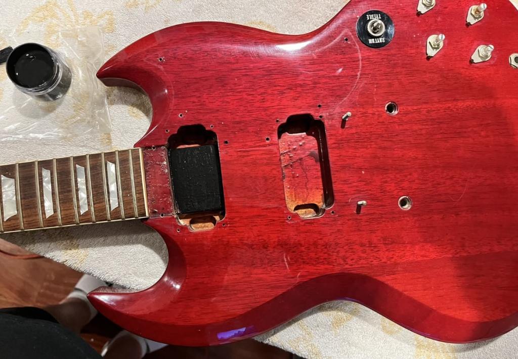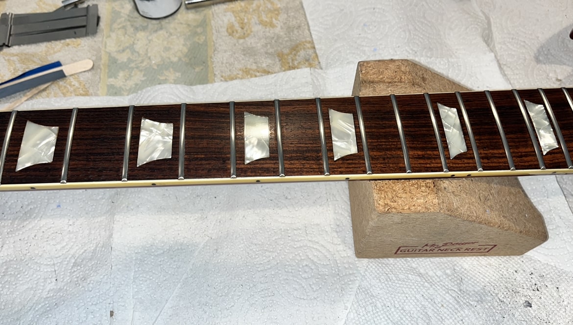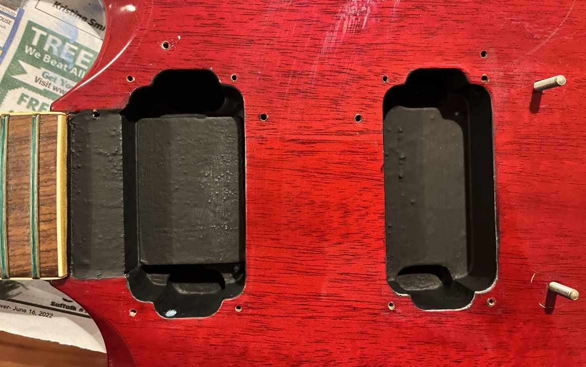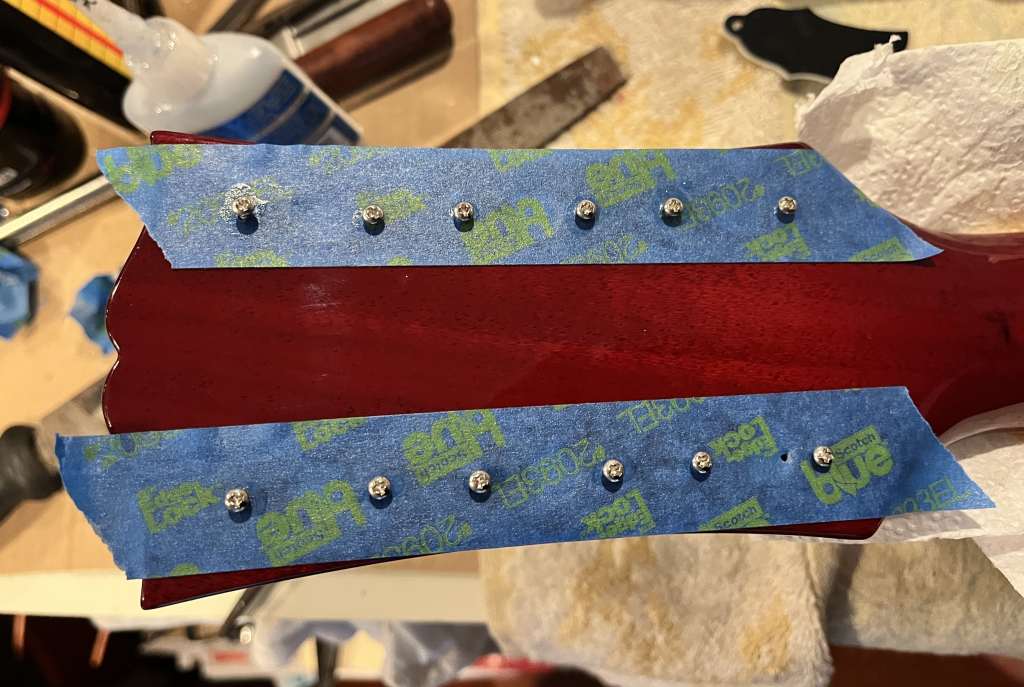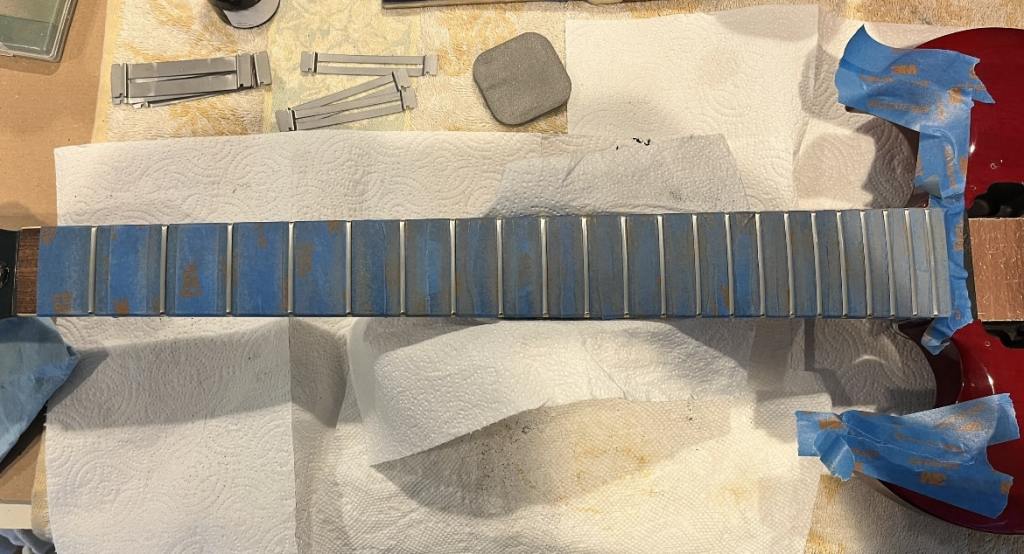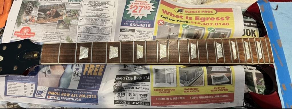 Straight from Japan2nd gen VH-1 pickupsFull size potsAdding shieldingThree coatsConnecting cavities with wireSanded the rough poly bumps outShielding paintMore shielding and connected the control cavity to the pickup routesControl Cavity all done.Shielded cavity coverNot mint but much better8.208k on the neck and 8.088k on the bridge (not a typo!)Took the cover off a pickup to see if it had ceramic magnets and found Alnico magnets instead!Removing rust with vinegarPickup screws restoredAll Cleaned upFrets beam leveledStarting to crown fretsFrets crowned and sanded smoothFretboard cleaned and oiledNice rosewood grainSanded smooth with 1500,2500 and then polishing the topangle shotBuffed up pickguardStarting to come togetherKnobs are too bright, I’m going to swap them out for more vintage reflectors.Sanded headstock and some touchupAll polished upCA glue added to fix loose tuner screwholesStarting to fit a new nut.Scribing board radiusNew nut complete