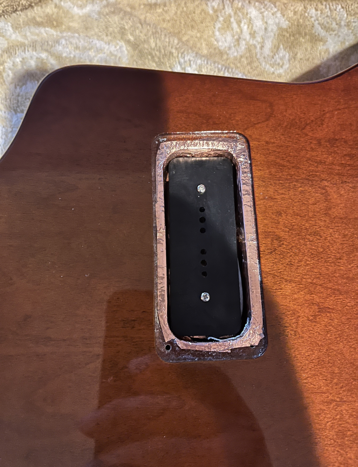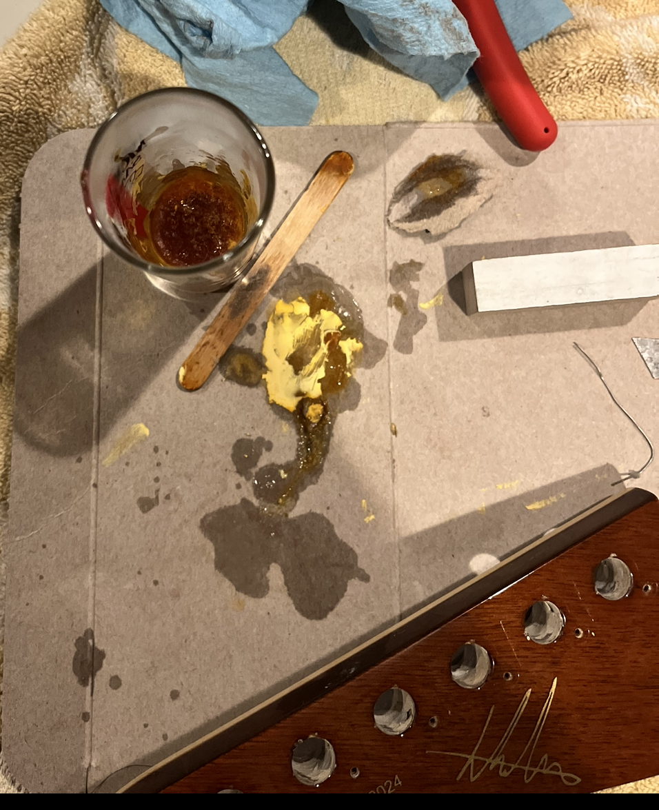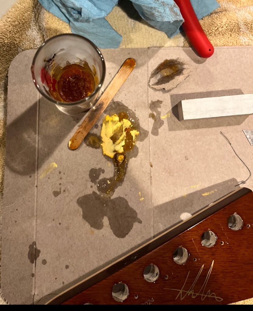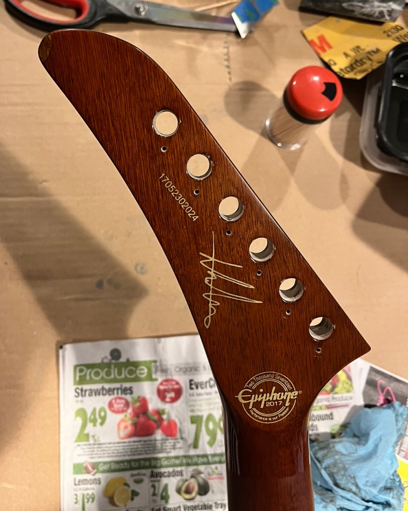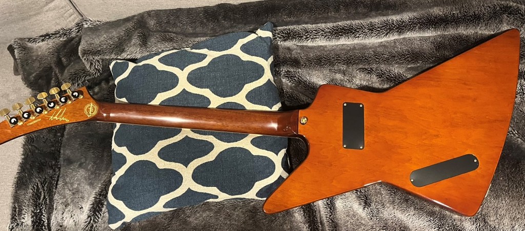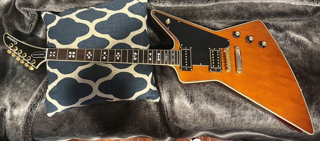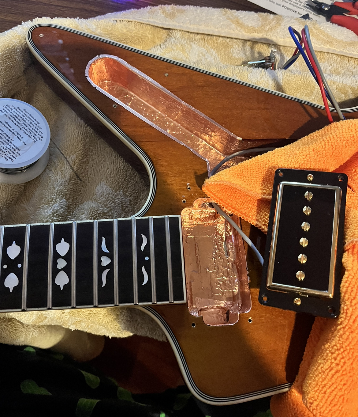 A pretty unique explorerNice size tip chipOuch!Mixing up tint and super glueCame out a little light but very smoothNot perfect but much less noticeableDe-glossed the neckSome details of the dummy coil wiring but from the les paul version of thisShielded the dummy cavity and flipped it, it was upside down causing hum.Shielded the top routes and pickguardGot some nice locking tuners and strings thanks to a friend! 🙂Black and gold theme matches the rest of the guitar perfectly.All finished