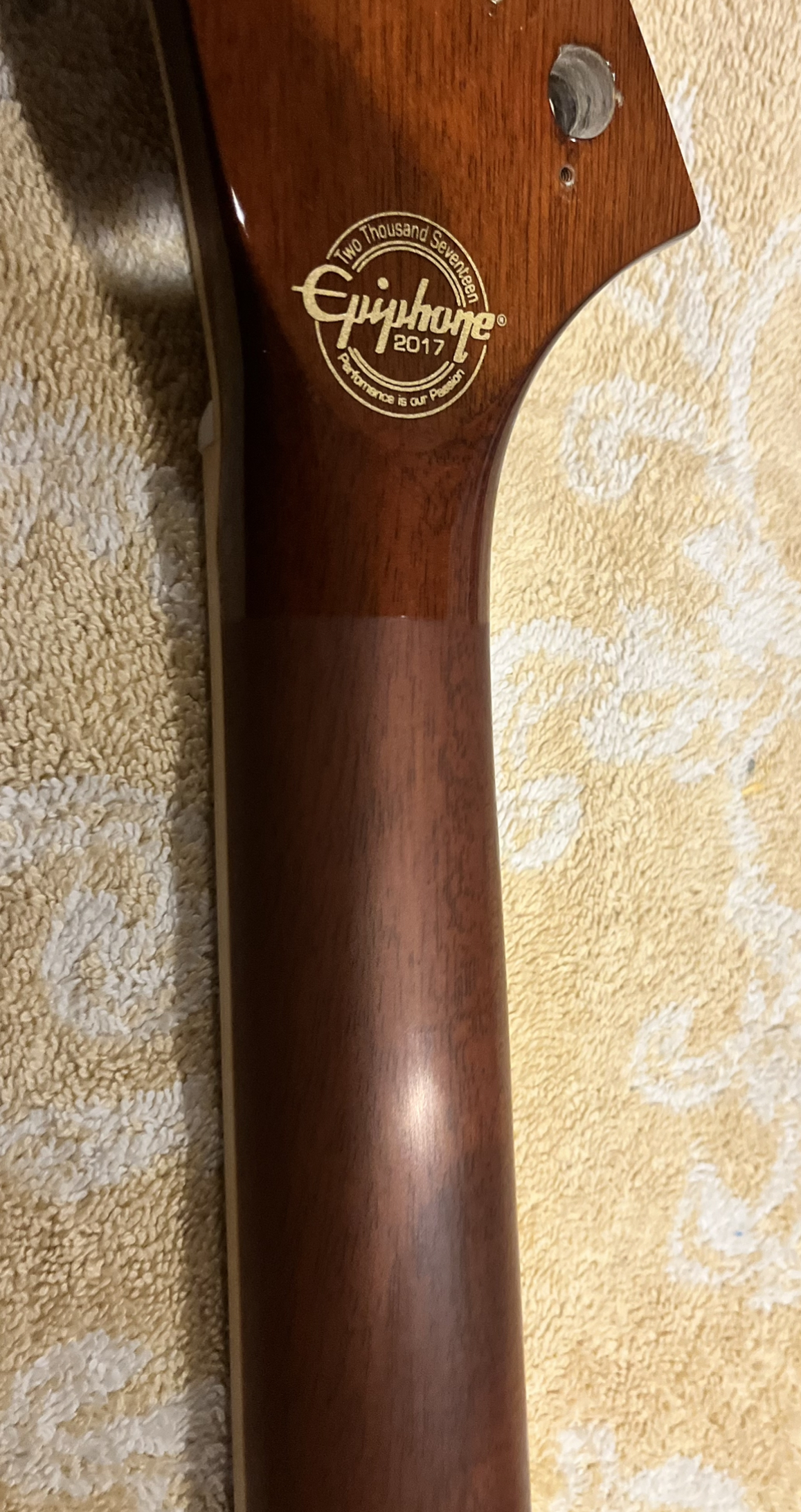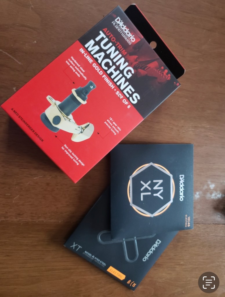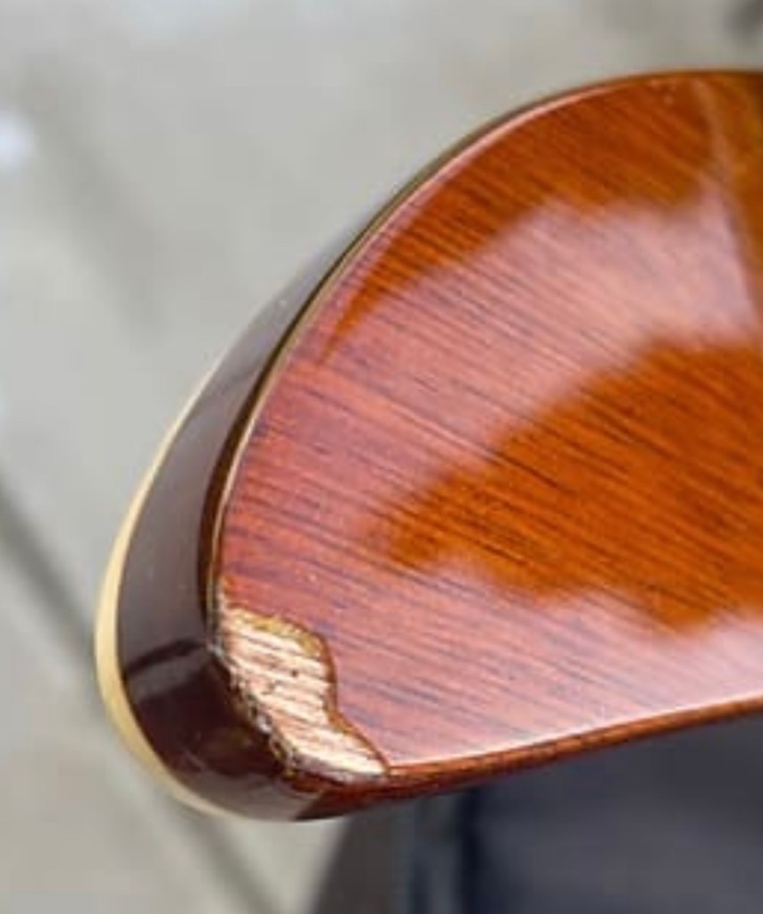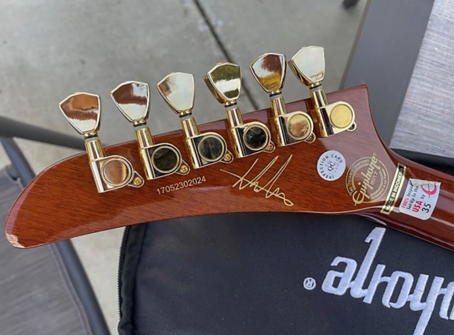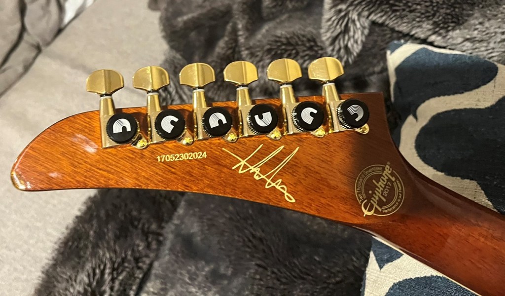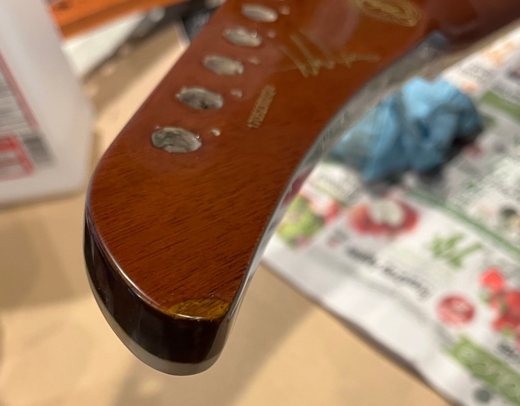 A pretty unique explorerNice size tip chipOuch!Mixing up tint and super glueCame out a little light but very smoothNot perfect but much less noticeableDe-glossed the neckSome details of the dummy coil wiring but from the les paul version of thisShielded the dummy cavity and flipped it, it was upside down causing hum.Shielded the top routes and pickguardGot some nice locking tuners and strings thanks to a friend! 🙂Black and gold theme matches the rest of the guitar perfectly.All finished