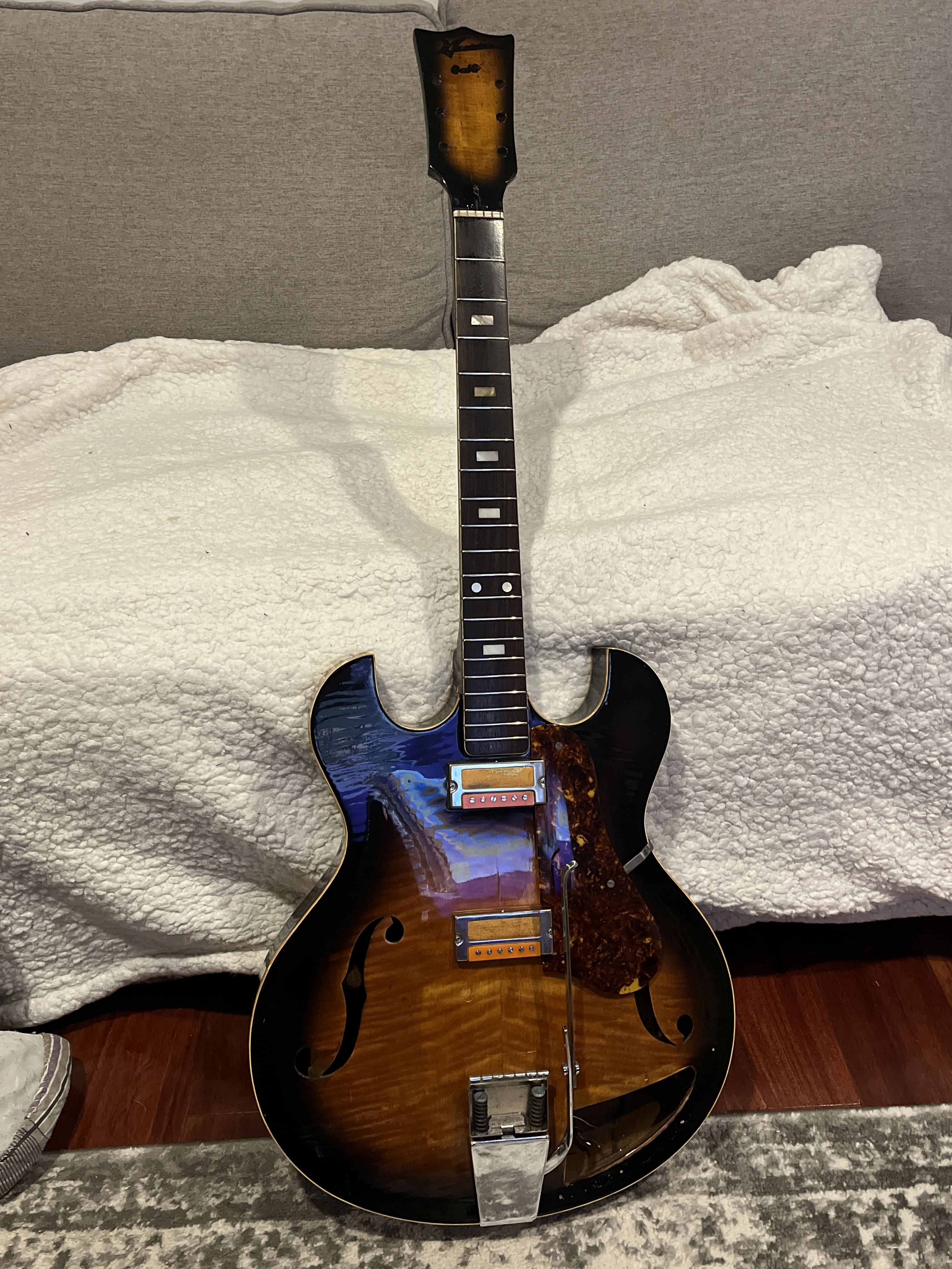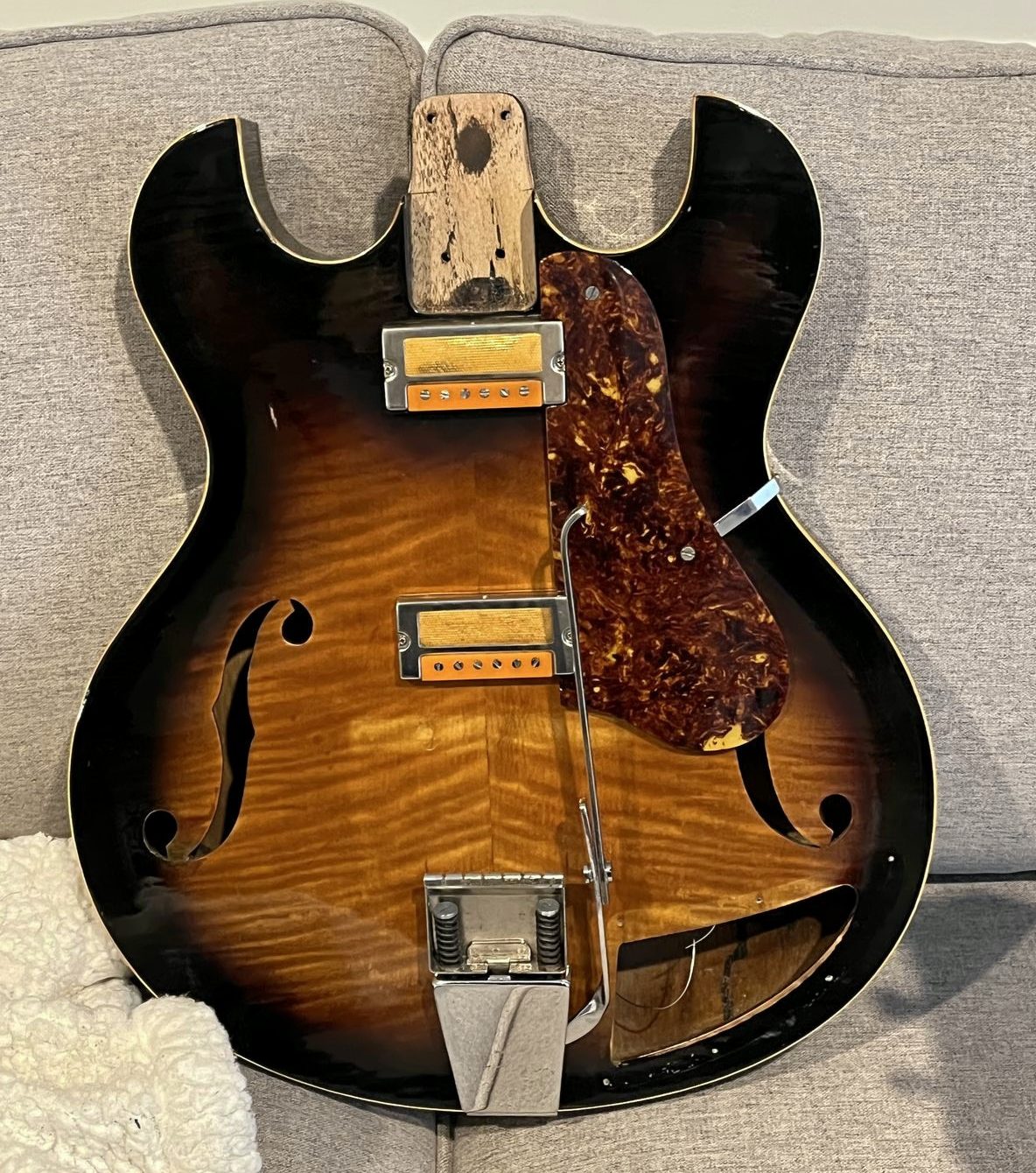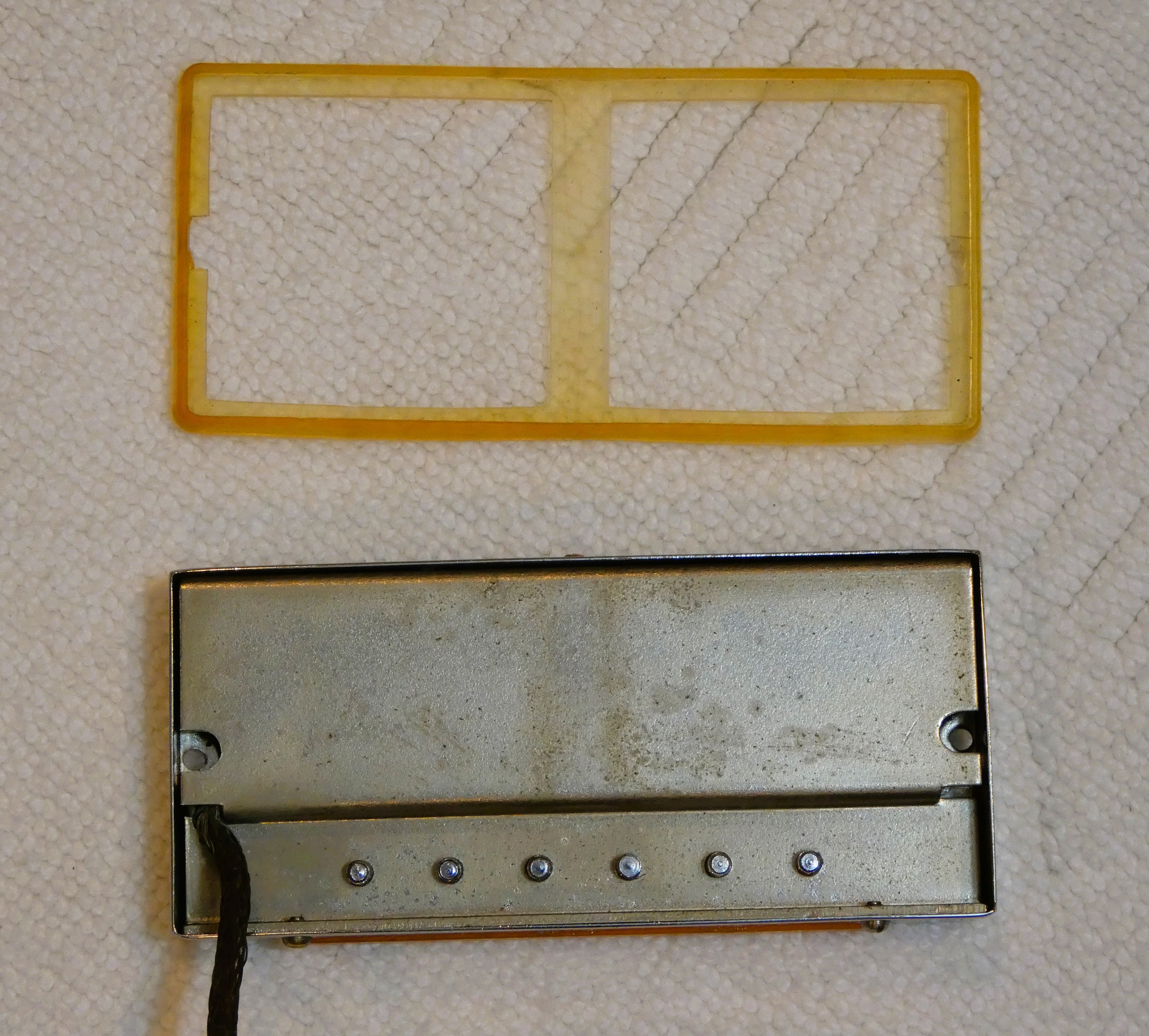 This neck pickup has some of the gold foil still left on the plastic material, but not much. It’s all decorative, so it only affects the looks and not the tone! It has scratches and some slight pitting, as can be expected for something this old. What you see is what you get. It has been taken apart, cleaned, polished completely, and tested. I think the Guyatone guitar that these came out of is from 1963, judging from a catalog clipping and the serial number stamped inside the body behind the control plate.